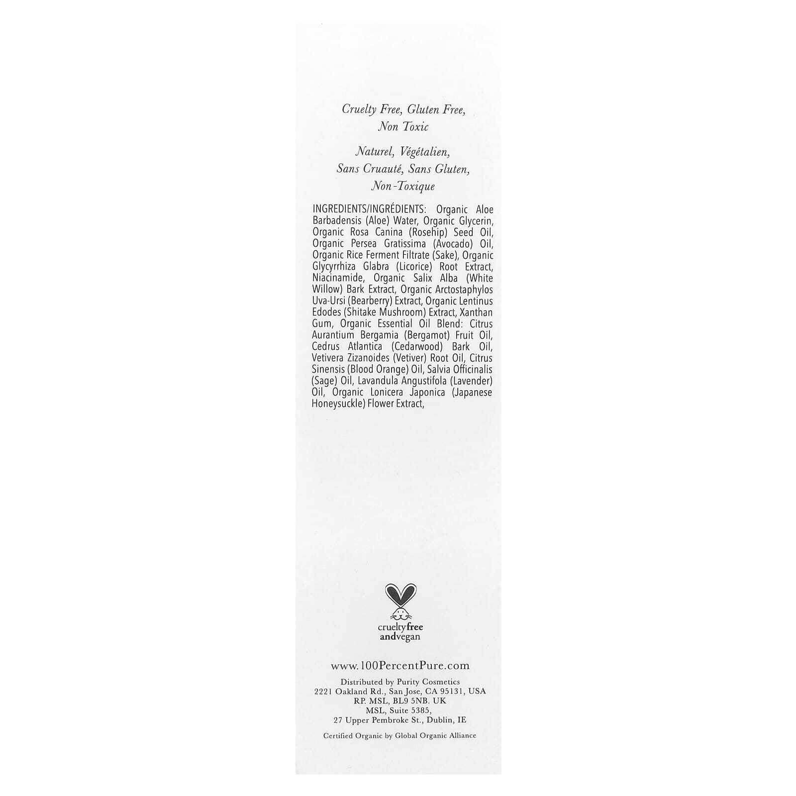 Органическая вода алоэ барбаденсис (Aloe barbadensis), органический глицерин, органическое масло семян шиповника (Rosa canina), органическое масло авокадо (Persea gratissima), фильтрат органических рисовых ферментов (саке), органический экстракт корня солодки (Glycyrrhiza glabra), никотинамид, органический экстракт коры белой ивы (Salix alba), органический экстракт толокнянки обыкновенной (Arctostaphylos uva-ursi), органический экстракт гриба шитаке (Lentinus edodes), ксантановая камедь, смесь органических эфирных масел: масло плодов бергамота (Citrus aurantium), масло из коры кедра (Cedrus atlantica), масло корня ветивера (vetivera zizanoides), масло красного апельсина (Citrus sinensis), масло шалфея (Salvia officinalis), масло лаванды (Lavandula angustifola), органический экстракт цветков жимолости японской (Lonicera japonica).