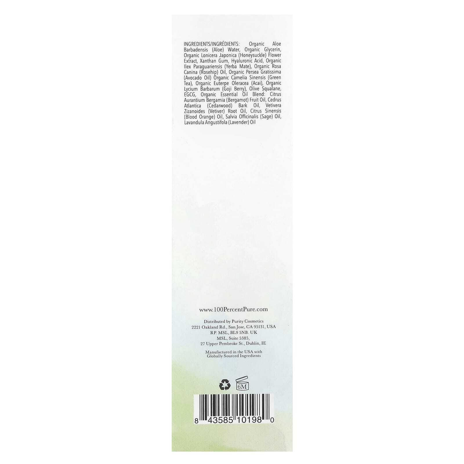 Органическая вода алоэ барбаденсис (Aloe barbadensis), органический глицерин, органический экстракт цветков жимолости (Lonicera japonica), ксантановая камедь, гиалуроновая кислота, органическая ilex paraguariensis (йерба мате), органическое масло шиповника (Rosa canina), органическое масло авокадо (Persea gratissima), органический зеленый чай (Camelia sinensis), органическая эвтерпа огородная (асаи), органический Lycium barbarum (ягоды годжи), оливковый сквалан, egcg, смесь органических эфирных масел: масло плодов бергамота (Citrus aurantium), масло из коры кедра (Cedrus atlantica), масло корня ветивера (vetivera zizanoides), масло красного апельсина (Citrus sinensis), масло шалфея (Salvia officinalis), масло лаванды (Lavandula angustifola).