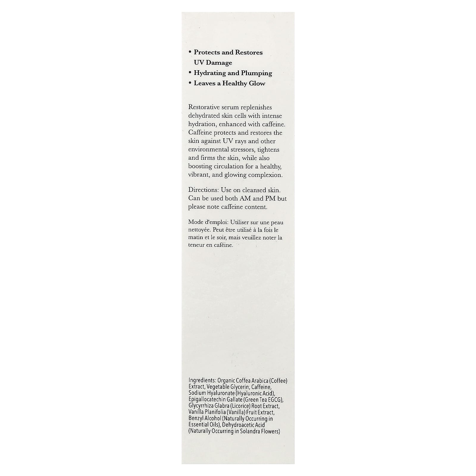 Восстанавливающая сыворотка восстанавливает обезвоженные клетки кожи, обеспечивая интенсивное увлажнение, усиленное кофеином. Кофеин защищает и восстанавливает кожу от УФ-лучей и других стрессовых факторов окружающей среды, подтягивает и повышает упругость кожи, а также улучшает кровообращение, обеспечивая здоровый, яркий и сияющий цвет лица.