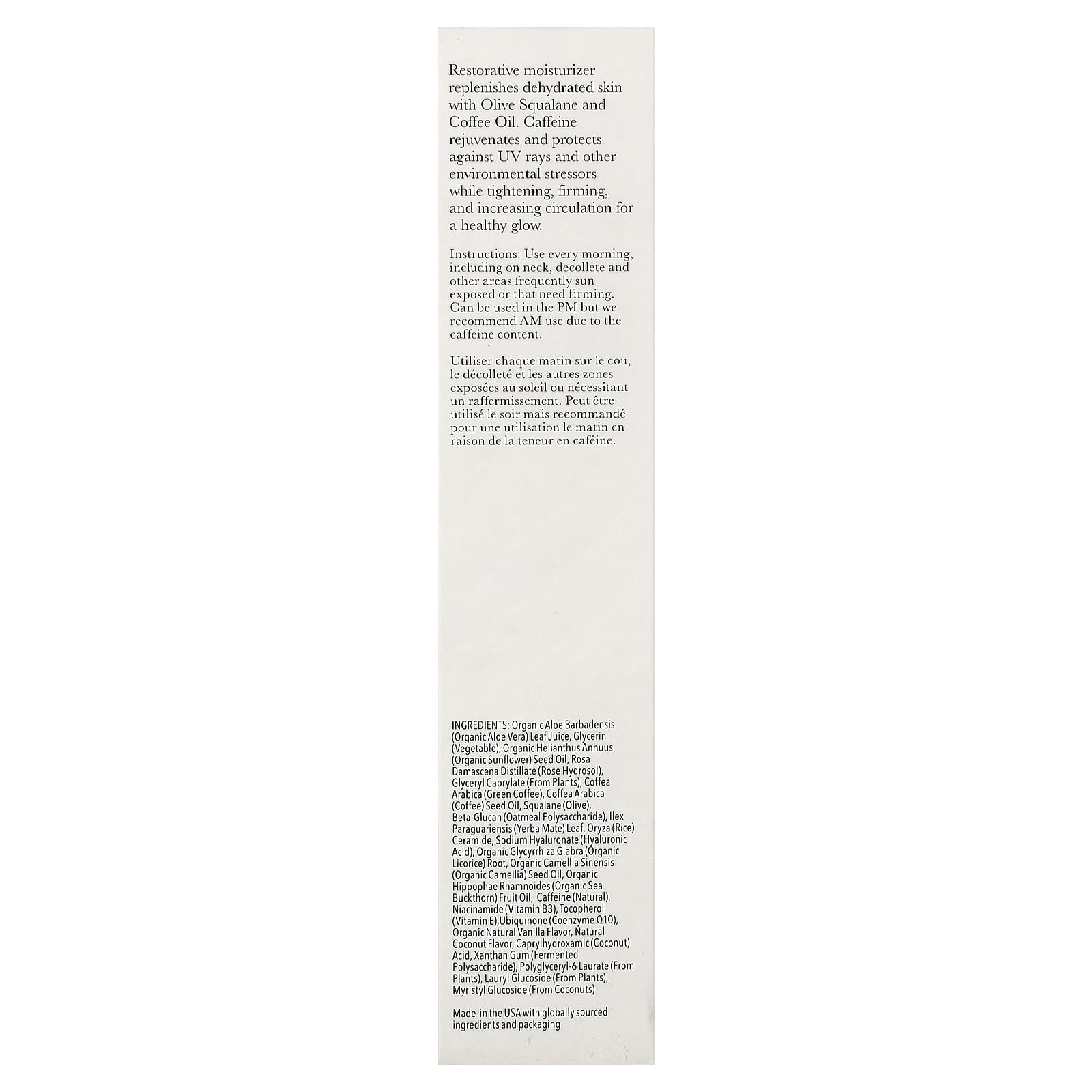 сок листьев органического алоэ вера (Aloe barbadensis), глицерин (растительный), органическое подсолнечное масло (Helianthus annuus), дистиллят из дамасской розы (Rosa damascena), глицерил каприлат (из растений), Coffea arabica (зеленый кофе), масло из зерен кофе арабики (Coffea arabica), сквалан (из оливкового масла), бета-глюкан (полисахарид из овсянки), листья йерба мате (Ilex paraguariensis), керамид из риса (Oryza), гиалуронат натрия (гиалуроновая кислота), корень органической солодки (Glycyrrhiza glabra), органическое масло семян органической камелии (Camellia sinensis), органическое масло облепихи (Hippophae rhamnoides), кофеин (натуральный), никотинамид (витамин B3), токоферол (витамин E), убихинон (коэнзим Q10), органический натуральный ароматизатор "Ваниль", натуральный ароматизатор "Кокос", каприлгидроксаминовая (кокосовая) кислота, ксантановая камедь (ферментированный полисахарид), полиглицерил-6 лаурат (из растений), лаурил глюкозид (из растений), миристил глюкозид (из кокосов).