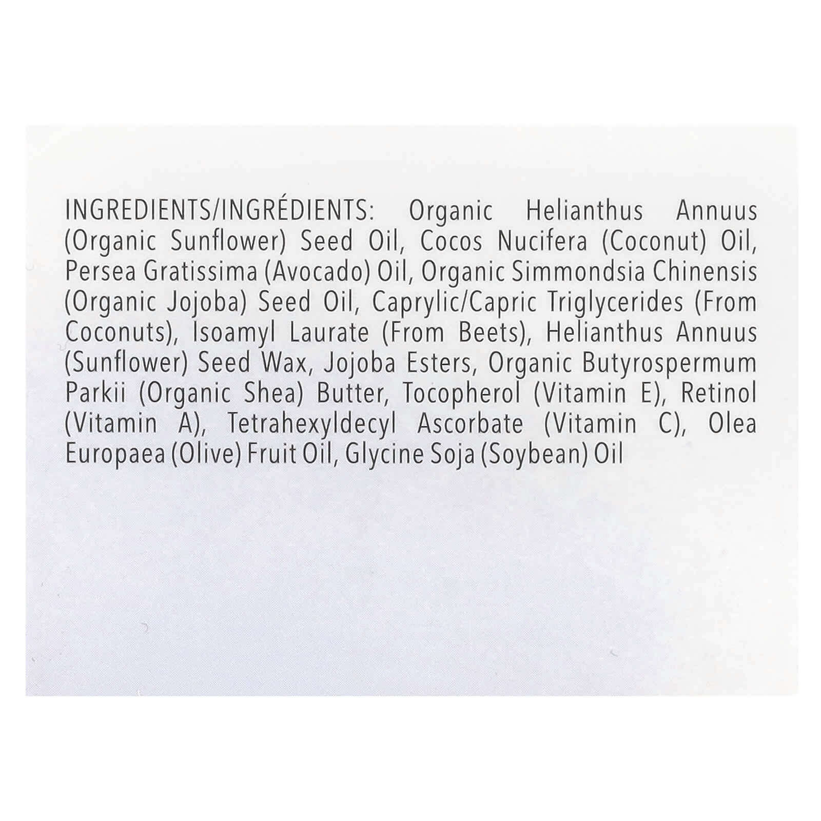Органическое подсолнечное масло (Helianthus annuus), кокосовое масло (Cocos nucifera), масло авокадо (Persea gratissima), органическое масло семян жожоба (Simmondsia chinensis), каприловые / каприновые триглицериды (из кокосов), изоамиллаурат (из свеклы), воск из семян подсолнечника (Helianthus annuus), эфиры жожоба, органическое масло ши (Butyrospermum parkii), токоферол (витамин Е), ретинол (витамин А), тетрагексилдецил аскорбат (витамин C), оливковое масло (Olea europaea), соевое масло (глицин).