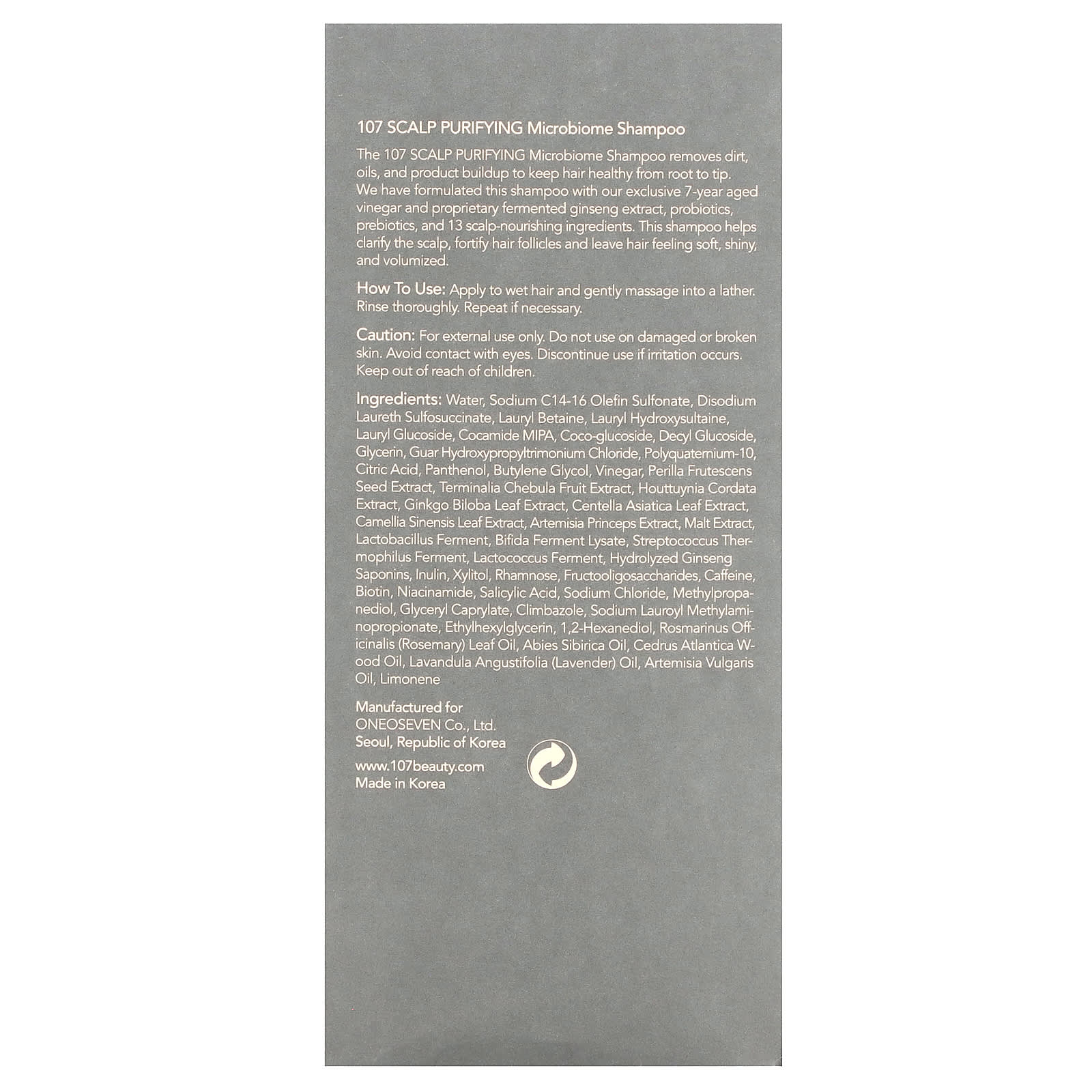 Шампунь 107 SCALP PURIFYING Microbiome удаляет грязь, жир и скопления продуктов, чтобы сохранить здоровье волос от корней до кончиков. В состав этого шампуня входит наш эксклюзивный уксус, выдержанный 7 лет, и запатентованный экстракт ферментированного женьшеня, пробиотики, пребиотики и 13 питательных ингредиентов для кожи головы. Этот шампунь помогает осветлить кожу головы, укрепить волосяные фолликулы и придает волосам мягкость, блеск и объем.
