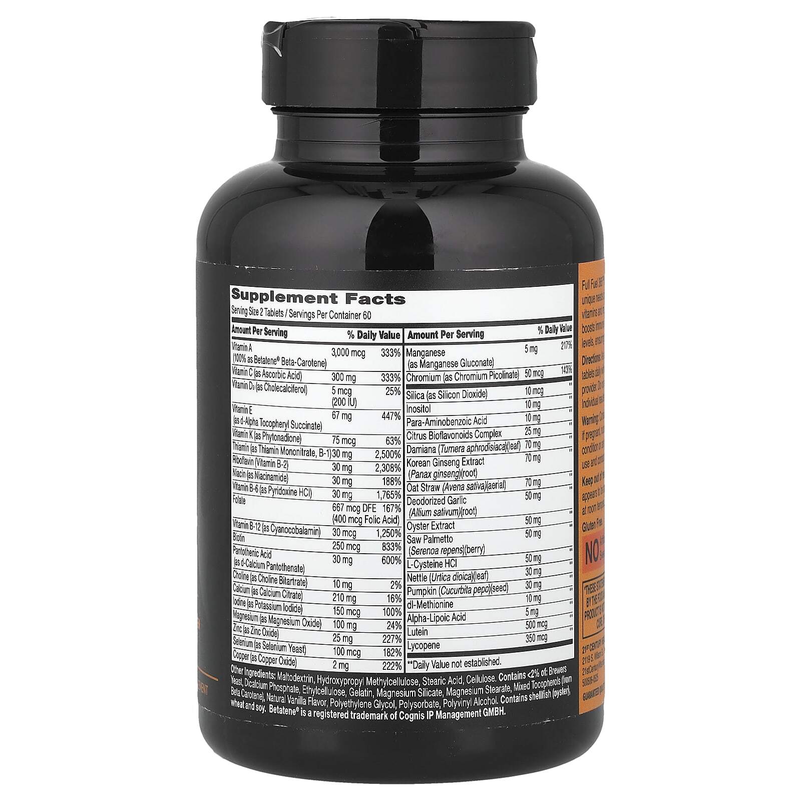 Мальтодекстрин, гидроксипропилметилцеллюлоза, стеариновая кислота, целлюлоза. Содержит < 2% пивных дрожжей, дикальций фосфат, этилцеллюлоза, желатина, силиката магния, стеарат магния, смешанные токоферолы (из бета-каротина), натуральный ароматизатор «Ваниль», полиэтиленгликоль, полисорбат, поливиниловый спирт.