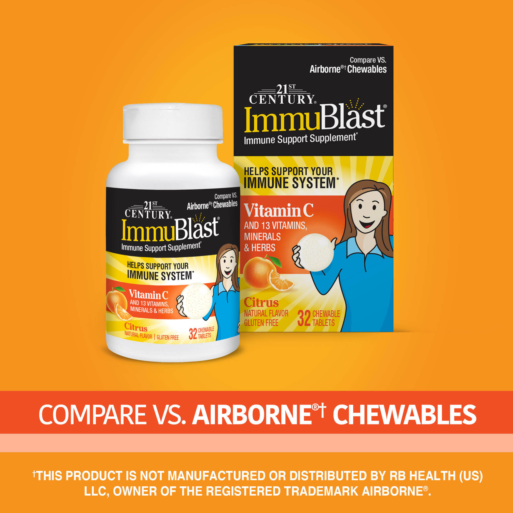 Принимайте витамин C в сочетании с 13 витаминами, минералами и травами для укрепления иммунитета. Жевательные таблетки ImmuBlast® от 21st Century® очень удобные, их можно принимать без воды. Просто разжуйте четыре таблетки и продолжайте заниматься делами. Наши натуральные жевательные таблетки с цитрусовым вкусом еще и очень вкусные!
