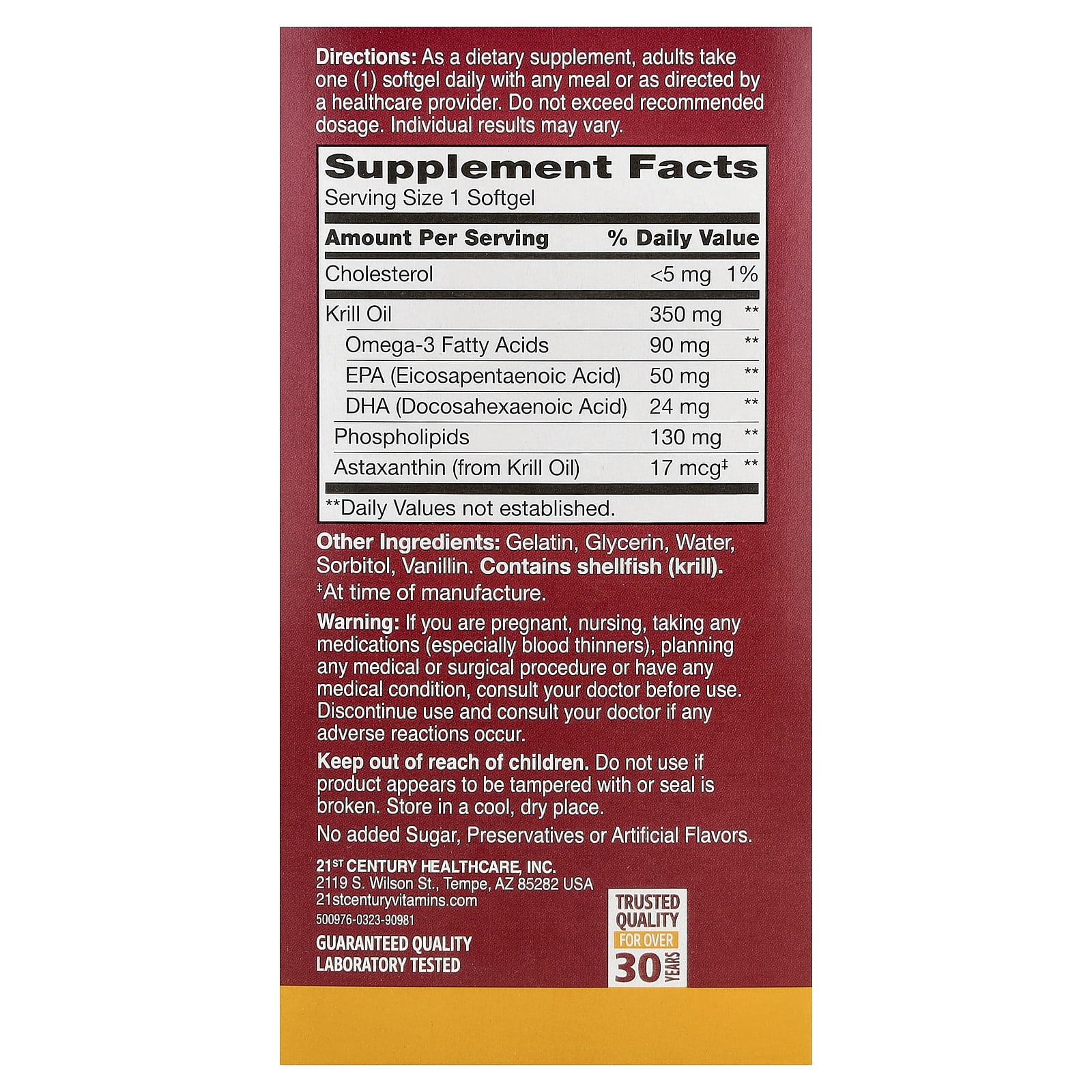 Масло криля 21st Century® содержит жирные кислоты омега-3.ЭПК и ДГК - важные омега-3 жирные кислоты, которые поддерживают здоровье сердечно-сосудистой системы, а также являются важными компонентами клеток организма.