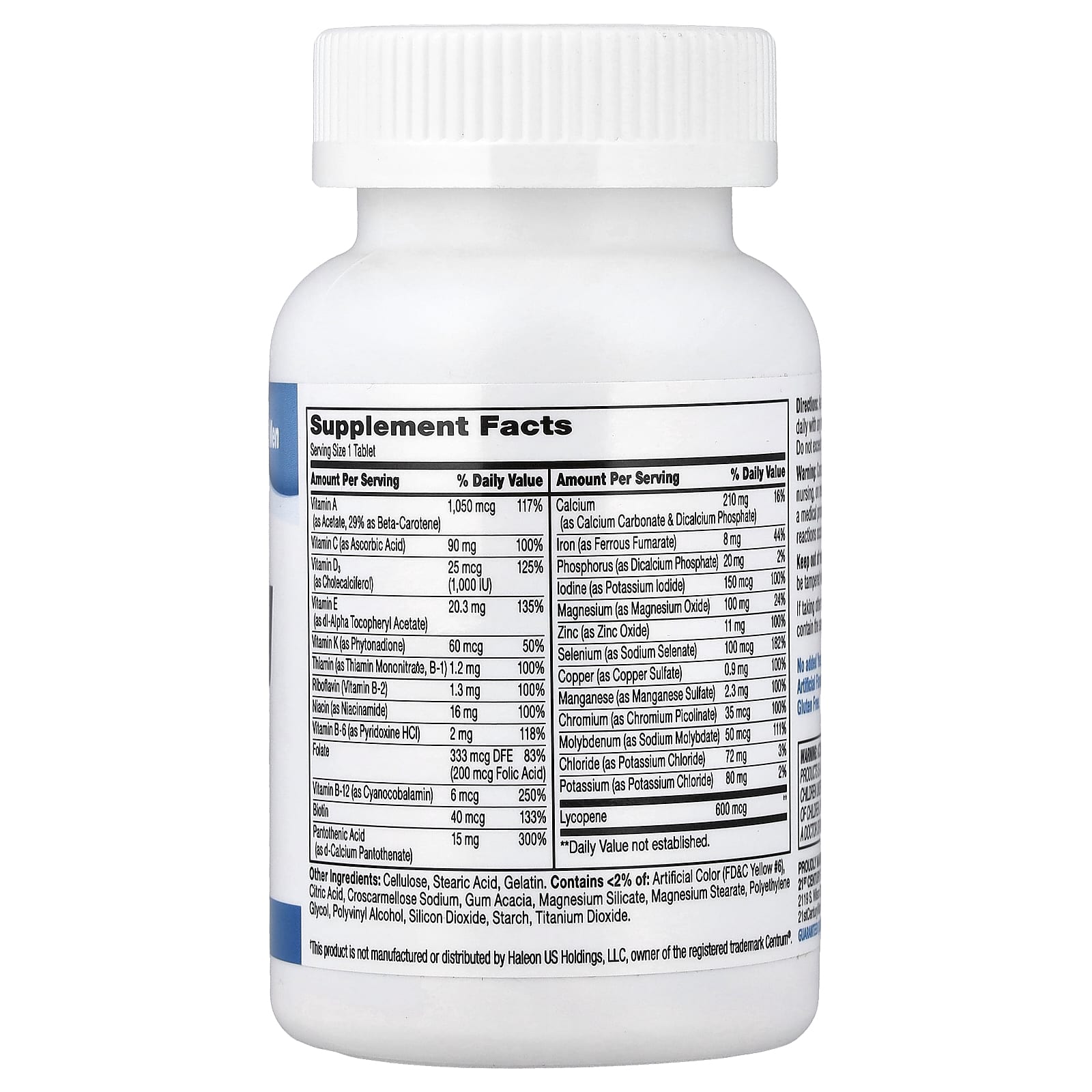Целлюлоза, стеариновая кислота, желатин. В упаковке< 2%: искусственного красителя (желтый 6 FD&C), лимонная кислота, кроскармеллоза натрия, аравийская камедь, силикат магния, стеарат магния, полиэтиленгликоль, поливиниловый спирт, двуокись кремния, крахмала, диоксид титана.