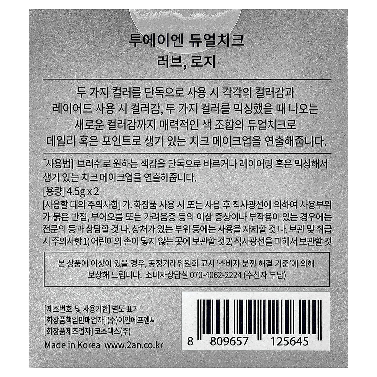 2aN, Dual Cheek, оттенок 02 Love, розовый, 9 г