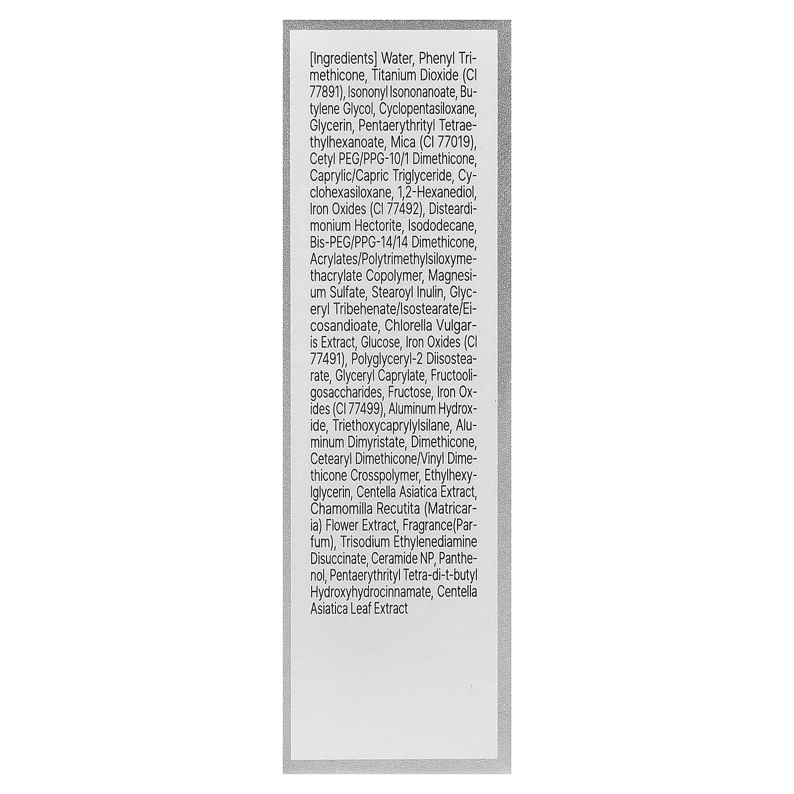 Вода, фенилтриметикон, диоксид титана (CI 77891), изононил изононаноат, бутиленгликоль, циклопентасилоксан, глицерин, пентаэритритил тетраэтилгексаноат, слюда (CI 77019), цетил ПЭГ/ППГ-10/1 диметикон, каприловый/каприновый триглицерид, циклогексасилоксан, 1,2-гександиол, оксиды железа (CI 77492), дистеардимония гекторит, изододекан, бис-ПЭГ/ППГ-14/14 диметикон, акрилаты/политриметилсилоксиметакрилат сополимер, сульфат магния, стеароил инулин, глицерил трибегенат/изостеарат/эйкозандиоат, экстракт хлореллы (Chlorella vulgaris), глюкоза, оксиды железа (CI 77491), полиглицерил-2 диизостеарат, глицерил каприлат, фруктоолигосахариды, фруктоза, оксиды железа (CI 77499), гидроксид алюминия, триэтоксикаприлилсилан, димиристат алюминия, диметикон, цетеарил диметикон/винил диметикон кроссполимер, этилгексилглицерин, экстракт готу колы (Centella asiatica), экстракт цветков ромашки лекарственной (Chamomilla recutita), отдушка (парфюмерная композиция), тринатрия этилендиамин дисукцинат, керамид NP, пантенол, пентаэритритил тетра-ди-трет-бутил гидроксигидроциннамат, экстракт листьев готу колы (Centella asiatica).