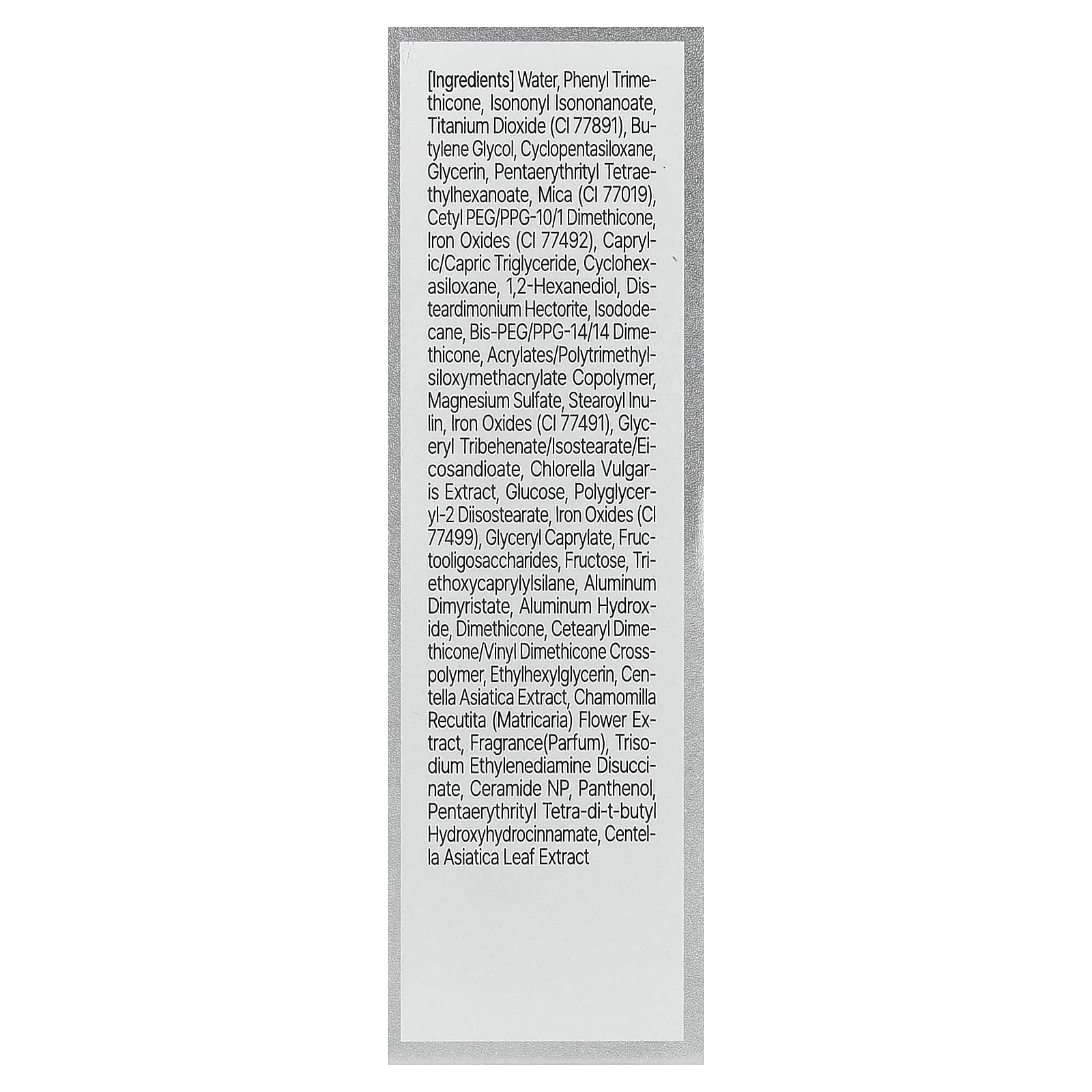 Вода, фенилтриметикон, изононил изононаноат, диоксид титана (CI 77891), бутиленгликоль, циклопентасилоксан, глицерин, пентаэритритил тетраэтилгексаноат, слюда (CI 77019), цетил ПЭГ/ППГ-10/1 диметикон, оксиды железа (CI 77492), каприловый/каприновый триглицерид, циклогексасилоксан, 1,2-гександиол, дистеардимония гекторит, изододекан, бис-ПЭГ/ППГ-14/14 диметикон, акрилаты/политриметилсилоксиметакрилат сополимер, сульфат магния, стеароил инулин, оксиды железа (CI 77491), глицерил трибегенат/изостеарат/эйкозандиоат, экстракт хлореллы (Chlorella vulgaris), глюкоза, полиглицерил-2 диизостеарат, оксиды железа (CI 77499), глицерил каприлат, фруктоолигосахариды, фруктоза, триэтоксикаприлилсилан, димиристат алюминия, гидроксид алюминия, диметикон, цетеарил диметикон/винил диметикон кроссполимер, этилгексилглицерин, экстракт готу колы (Centella asiatica), экстракт цветков ромашки лекарственной (Chamomilla recutita), отдушка (парфюмерная композиция), тринатрия этилендиамин дисукцинат, керамид NP, пантенол, пентаэритритил тетра-ди-трет-бутил гидроксигидроциннамат, экстракт листьев готу колы (Centella asiatica).