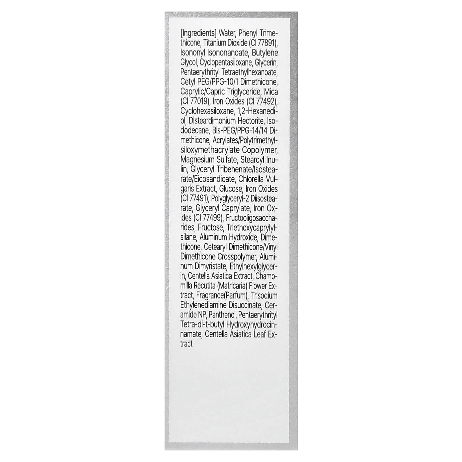 Вода, фенилтриметикон, диоксид титана (CI 77891), изононил изононаноат, бутиленгликоль, циклопентасилоксан, глицерин, пентаэритритил тетраэтилгексаноат, цетил ПЭГ/ППГ-10/1 диметикон каприловый/каприновый триглицерид, слюда (CI 77019), оксиды железа (CI 77492), циклогексасилоксан, 1,2-гександиол, дистеардимония гекторит, изододекан, бис-ПЭГ/ППГ-14/14 диметикон, акрилаты/политриметилсилоксиметакрилат сополимер, сульфат магния, стеароил инулин, глицерил трибегенат/изостеарат/эйкозандиоат, экстракт хлореллы (Chlorella vulgaris), глюкоза, оксиды железа (CI 77491), полиглицерил-2 диизостеарат, глицерил каприлат, оксиды железа (CI 77499), фруктоолигосахариды, фруктоза, триэтоксикаприлилсилан, гидроксид алюминия, диметикон, цетеарил диметикон/винил диметикон кроссполимер, димиристат алюминия, этилгексилглицерин, экстракт готу колы (Centella asiatica), экстракт цветков ромашки лекарственной (Chamomilla recutita), отдушка (парфюмерная композиция), тринатрия этилендиамин дисукцинат, керамид NP, пантенол, пентаэритритил тетра-ди-трет-бутил гидроксигидроциннамат, экстракт листьев готу колы (Centella asiatica).