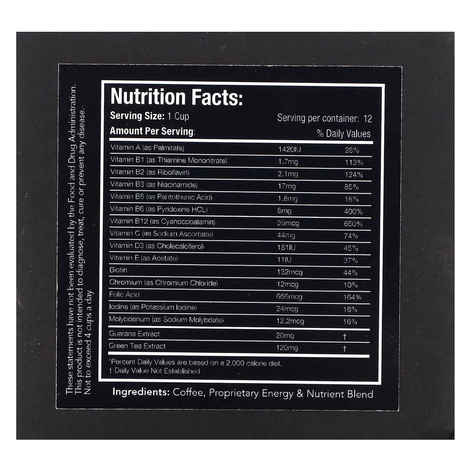 Кофе с огромной суточной дозой мультивитаминов для дополнительной силы, концентрации и энергии. Используя наш чистый, натуральный кофеин из зеленого чая.