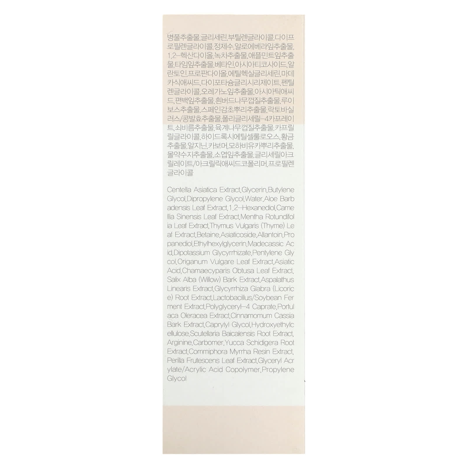 Экстракт готу колы (Centella asiatica), глицерин, бутиленгликоль, дипропиленгликоль, вода, экстракт листьев алоэ вера (Aloe barbadensis), 1,2-гександиол, экстракт листьев зеленого чая (Camellia sinensis), экстракт листьев мяты яблочной (Mentha rotundifolia), экстракт листьев чабреца (Thymus vulgaris), бетаин, азиатикозид, аллантоин, пропандиол, этилгексилглицерин, мадекассовая кислота, дикалия глицирризат, пентилен гликоль, экстракт листьев орегано (Origanum vulgare), азиатиковая кислота, экстракт листьев кипарисовика туполистного (Chamaecyparis obtusa), экстракт коры ивы (Salix alba), экстракт ройбуша (Aspalathus linearis), экстракт корня солодки (Glycyrrhiza glabra), ферментированный экстракт лактобактерии и соевых бобов, полиглицерил-4 капрат, экстракт портулака огородного (Portulaca oleracea), экстракт коры кассии (Cinnamomum cassia), каприлилгликоль, гидроксиэтилцеллюлоза, экстракт корня шлемника (Scutellaria baicalensis), аргинин, карбомер, экстракт корня юкки Шидигера (Yucca schidigera), экстракт камеди коммифоры мирровой (Commiphora myrrha), экстракт листьев периллы (Perilla ocymoides), сополимер глицерил акрилата/акриловой кислоты, пропиленгликоль.