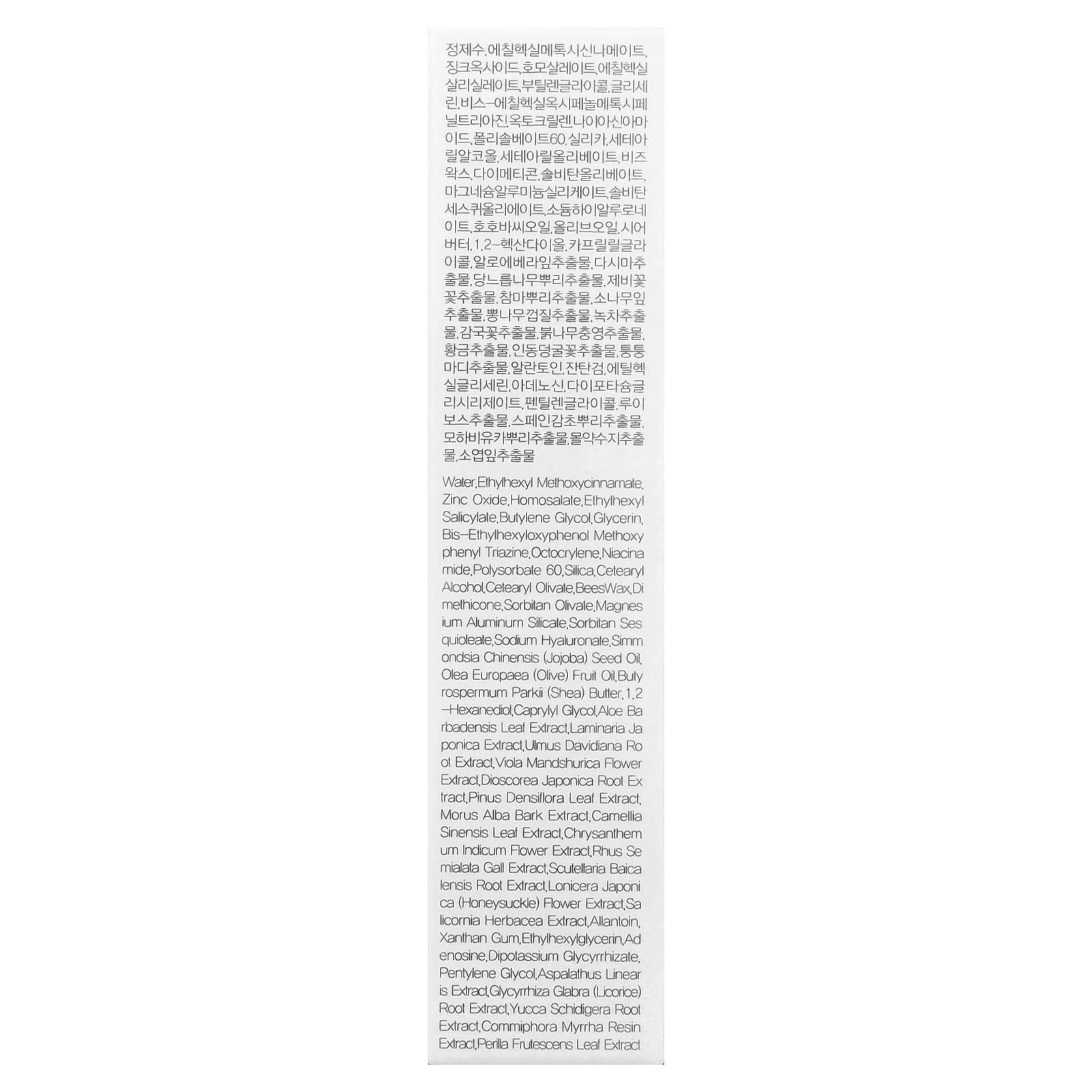 Вода, этилгексил метоксициннамат, оксид цинка, гомосалат, этилгексил салицилат, бутиленгликоль, глицерин, бис-этилгексилоксифенол метоксифенил триазин, октокрилен, никотинамид, полисорбат 60, диоксид кремния, цетеариловый спирт, цетеарил оливат, пчелиный воск, диметикон, сорбитан оливат, алюмосиликат магния, сорбитана сесквиолеат, гиалуронат натрия, масло семян жожоба (Simmondsia chinensis), оливковое масло (Olea europaea), масло ши (Butyrospermum parkii), 1,2-гександиол, каприлилгликоль, экстракт листьев алоэ вера (Aloe barbadensis), экстракт ламинарии японской (Laminaria japonica), экстракт корня вяза Давида (Ulmus davidiana), экстракт цветков фиалки (Viola mandshurica), экстракт корня ямса японского (Dioscorea japonica), экстракт листьев сосны (Pinus densiflora), экстракт коры шелковицы белой (Morus alba), экстракт листьев зеленого чая (Camellia sinensis), экстракт цветков хризантемы индийской (Chrysanthemum indicum), экстракт сумаха китайского (Rhus semialata), экстракт корня шлемника (Scutellaria baicalensis), экстракт цветков жимолости (Lonicera japonica), экстракт солероса европейского (Salicornia herbacea), аллантоин, ксантановая камедь, этилгексилглицерин, аденозин, дикалия глицирризат, пентилен гликоль, экстракт ройбуша (Aspalathus linearis), экстракт корня солодки (Glycyrrhiza glabra), экстракт корня юкки Шидигера (Yucca schidigera), экстракт смолы коммифоры мирровой (Commiphora myrrha), экстракт листьев периллы (Perilla ocymoides).