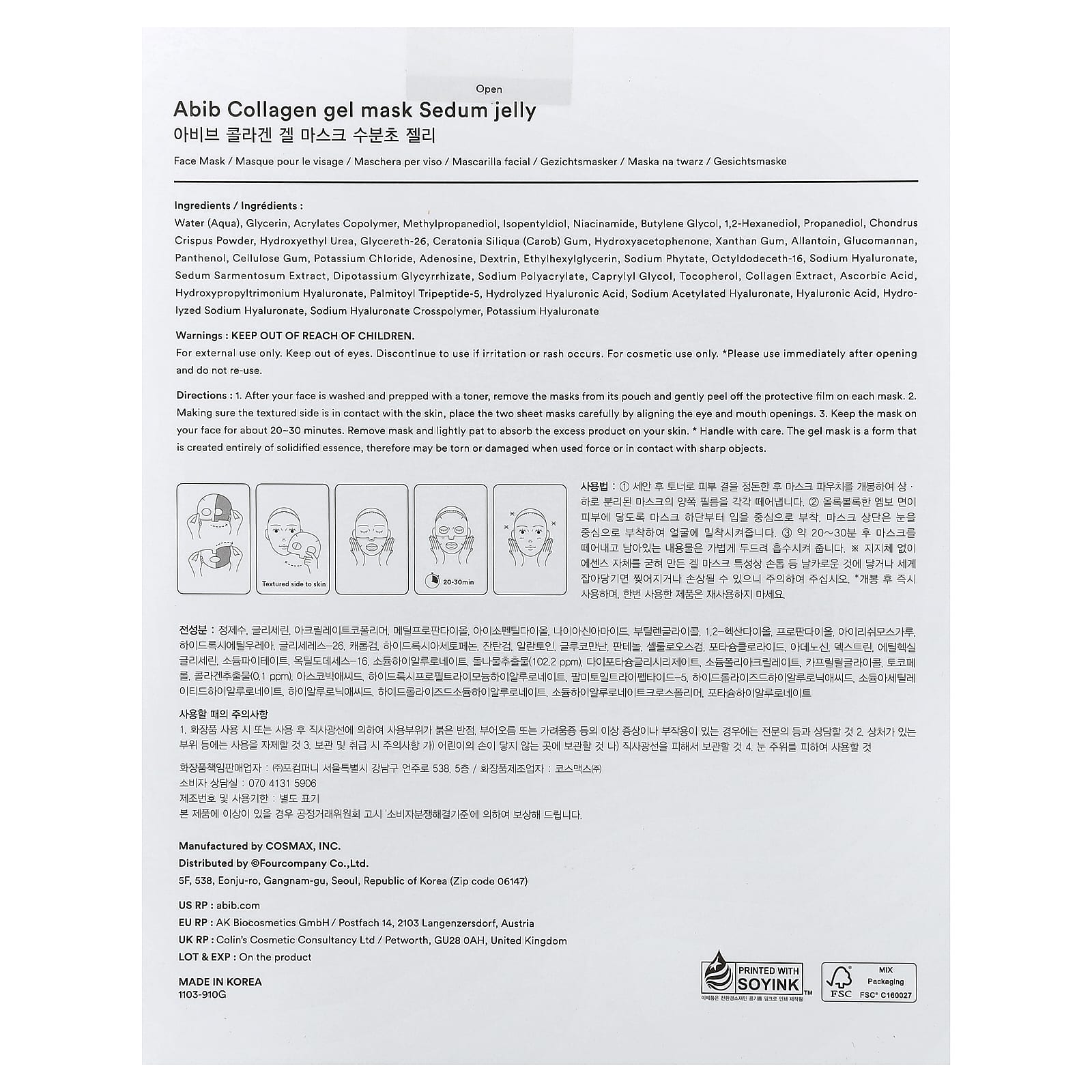 Вода (Aqua), глицерин, сополимер акрилатов, метилпропандиол, изопентилдиол, никотинамид, бутиленгликоль, 1,2-гександиол, пропандиол, порошок из ирландского мха (Chondrus crispus), гидроксиэтилированная мочевина, глицерет-26, камедь рожкового дерева (Ceratonia siliqua), гидроксиацетофенон, ксантановая камедь, аллантоин, глюкоманнан, пантенол, целлюлозная камедь, хлорид калия, аденозин, декстрин, этилгексилглицерин, фитат натрия, октилдодецет-16, гиалуронат натрия, экстракт очитка (Sedum сарmentosum), дикалия глицирризат, полиакрилат натрия, каприлилгликоль, токоферол, экстракт коллагена, аскорбиновая кислота, гиалуронат гидроксипропилтримония, пальмитоил трипептид-5, гидролизованная гиалуроновая кислота, ацетилированный гиалуронат натрия, гиалуроновая кислота, гидролизованный гиалуронат натрия, кроссполимер гиалуроната натрия, гиалуронат калия.