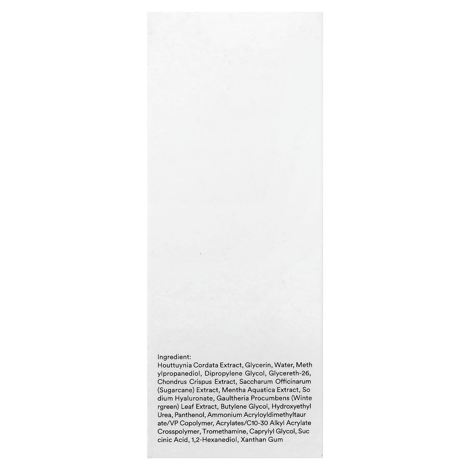 Экстракт хауттюйнии сердцевидной (Houttuynia cordata), глицерин, вода, метилпропандиол, дипропиленгликоль, глицерет-26, экстракт ирландского мха (Chondrus crispus), экстракт сахарного тростника (Saccharum officinarum), экстракт мяты водной, гиалуронат натрия, экстракт листьев грушанки (Gaultheria procumbens), бутиленгликоль, гидроксиэтилированная мочевина, пантенол, аммоний акрилоилдиметилтаурат/ВП сополимер, акрилат/c10-30 алкил акрилат кроссполимер, трометамин, каприлилгликоль, янтарная кислота, 1,2-гександиол, ксантановая камедь.