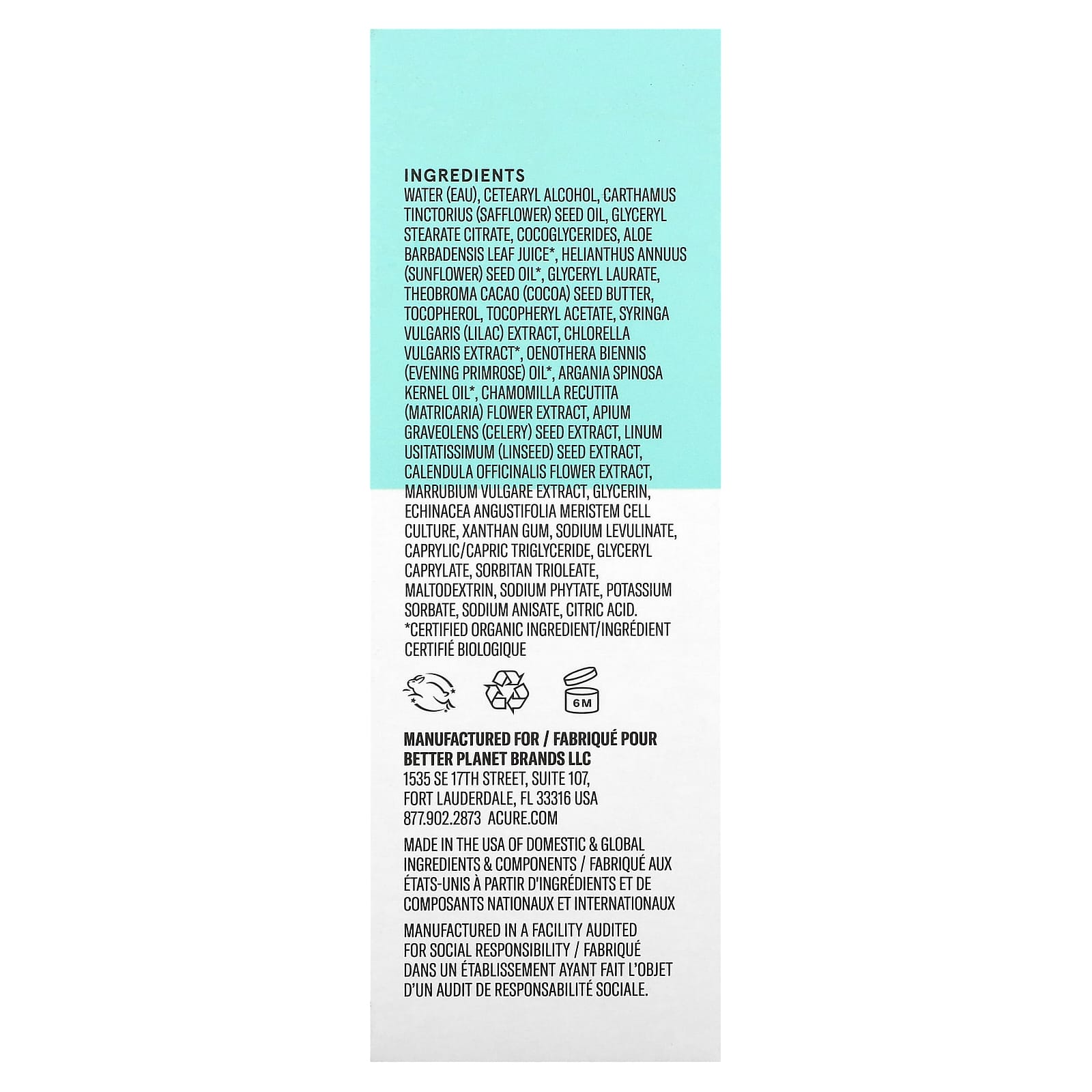 Вода, сок листьев алоэ вера (Aloe barbadensis)*, глицерил стеарат цитрат, цетеариловый спирт, глицерил каприлат, масло подсолнуха (Helianthus annuus), масло сафлоровое (Carthamus tinctorius), цетеариловый спирт, масло зерен какао (Theobroma cacao), глицериды кокосового масла, глицерин, левулинат натрия, сорбат калия, глицерил лаурат, токоферол, оливковое масло (Olea europaea), экстракт цветков календулы (Calendula officinalis), токоферилацетат (витамин E), масло примулы вечерней (Oenothera biennis), убихинон (коэнзим Q10), аргановое масло (Argania spinosa)*, культура клеток меристемы сирени (Syringa vulgaris), культура клеток меристемы шандры (Marrubium vulgare), культура клеток меристемы эхинацеи узколистной (Echinacea angustifolia), экстракт хлореллы (Chlorella pyrenoidosa), экстракт ягод асаи (Euterpe oleracea)*, экстракт ежевики (Rubus fructicosus)*, экстракт граната (Punica granatum)*, экстракт плодов шиповника (Rosa canina)*, экстракт цветков календулы (Calendula officinalis)*, экстракт цветков ромашки (Chamomilla recutita)*, экстракт листьев ройбуша (Aspalathus linearis)*.