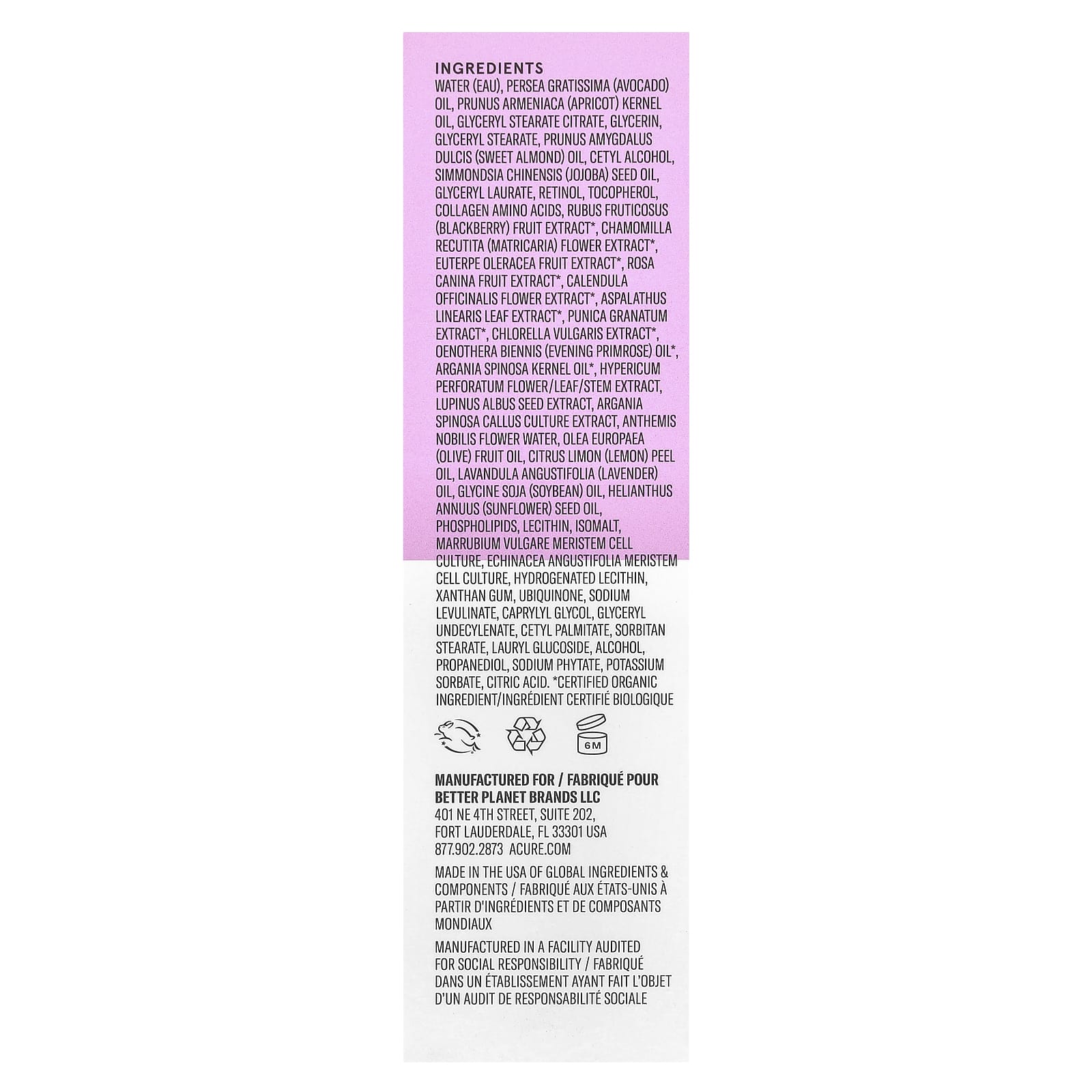 Вода (eau), масло авокадо (Persea gratissima), масло из косточек абрикоса (Prunus armeniaca), глицерил стеарат цитрат, глицерин, глицерил стеарат, масло сладкого миндаля (Prunus amygdalus dulcis), цетиловый спирт, масло из семян жожоба (Simmondsia chinensis), глицерил лаурат, ретинол, токоферол, коллагеновые аминокислоты, экстракт плодов ежевики (Rubus fructicosus)*, экстракт цветков ромашки (Chamomilla recutita)*, экстракт плодов огородного (Euterpe oleracea)*, экстракт плодов шиповника (Rosa canina)*, экстракт цветков календулы (Calendula officinalis)*, экстракт листьев ройбуша (Aspalathus linearis)*, экстракт граната (Punica granatum)*, экстракт хлореллы (Chlorella vulgaris)*, масло примулы вечерней (Oenothera biennis)*, аргановое масло (Argania spinosa)*, экстракт из цветков/листьев/стебля зверобоя пронзеннолистного (hypericum perforatum), экстракт семян люпина белого (Lupinus albus), экстракт каллусной культуры арганы (Argania spinosa), вода из цветков ромашки английской (Anthemis nobilis), оливковое масло (Olea europaea), масло из цедры лимона (Citrus limon), лавандовое масло (Lavandula angustifolia), соевое масло (Glycine soja), подсолнечное масло (Helianthus annuus), фосфолипидов, лецитин, изомальт, культура клеток меристемы шандры (Marrubium vulgare), культура клеток меристемы эхинацеи узколистной (Echinacea angustifolia), гидрогенизированный лецитин, ксантановая камедь, убихинон, левулинат натрия, каприлилгликоль, глицерил ундециленат, цетил пальмитат, сорбитан стеарат, лаурил глюкозид, спирт, пропандиол, фитат натрия, сорбат калия, лимонная кислота.