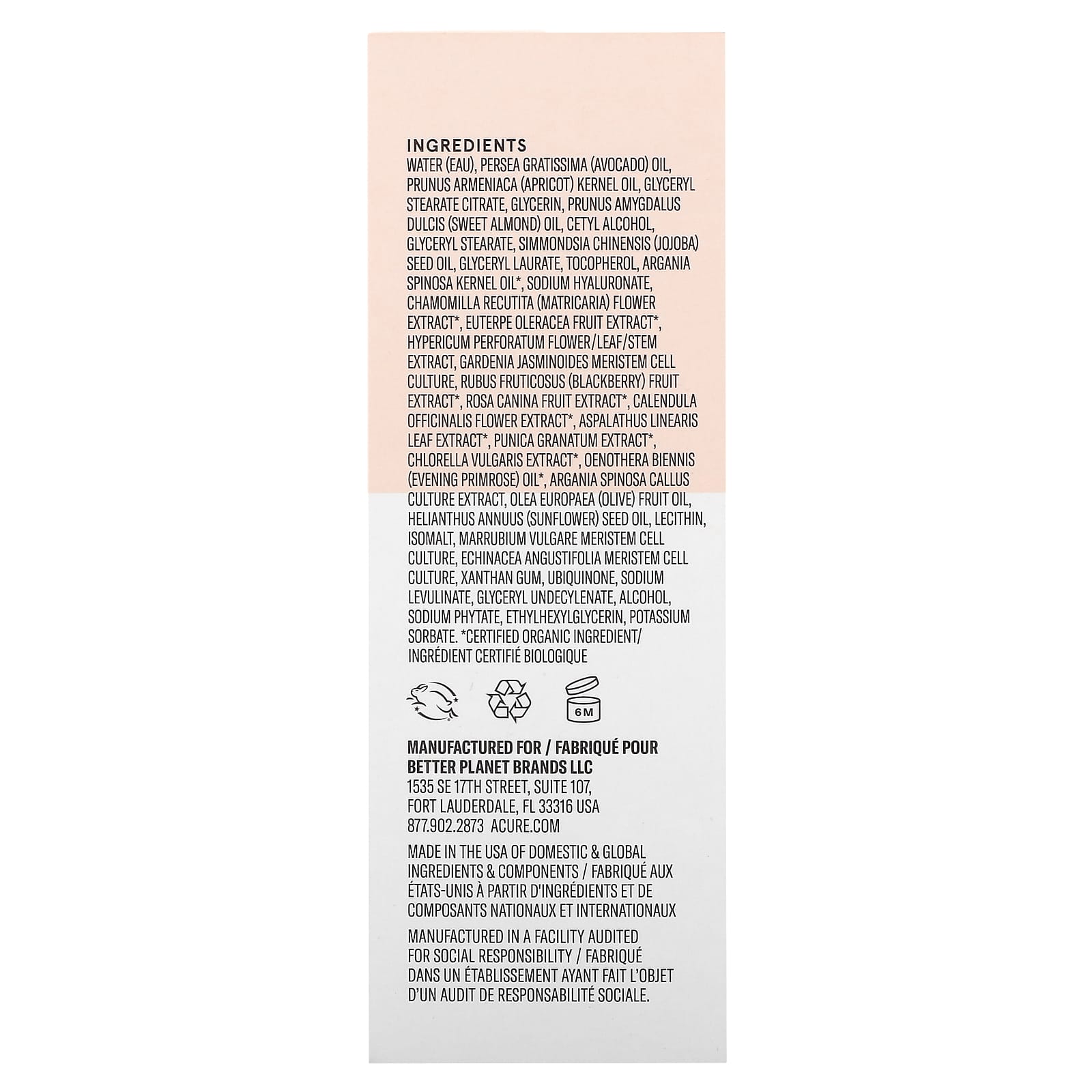 Вода, масло плодов авокадо (Persea grattisima), масло из косточек абрикоса (Prunus armeniaca), глицерил стеарат цитрат, глицерин, масло сладкого миндаля (Prunus amygdalus dulcis), глицерил стеарат, цетиловый спирт, масло из семян жожоба (Simmondsia chinensis), глицерил лаурат, оливковое масло холодного отжима (Olea europaea), масло примулы вечерней (Oenothera biennis)*, глицерил ундециленат, левулинат натрия, ксантановая камедь, гиалуронат натрия (гиалуроновая кислота), лавандовое масло (Lavandula angustifolia), сорбат калия, этанол*, экстракт цветков / листьев / стеблей зверобоя (Hypericum perforatum), токоферол, масло из цедры красного мандарина (Citrus reticulata), фитат натрия (из риса), масло из цветков ромашки (Anthemis nobilis), масло из листьев майорана (Origanum majorana), экстракт цветков ромашки, экстракт ягод асаи (Euterpe oleracea)*, экстракт плодов ежевики (Rubus fructicosus)*, экстракт плодов шиповника (Rosa canina)*, экстракт плодов граната (Punica granatum)*, экстракт цветков календулы (Calendula officinalis)*, экстракт цветков ромашки (Chamomilla recutita)*, экстракт листьев ройбуша (Aspalathus linearis)*, масло из косточек арганы (Argania spinosa)*, культура клеток меристемы Gardenia jasminoides, chlorella pyrenoidosa extract*.