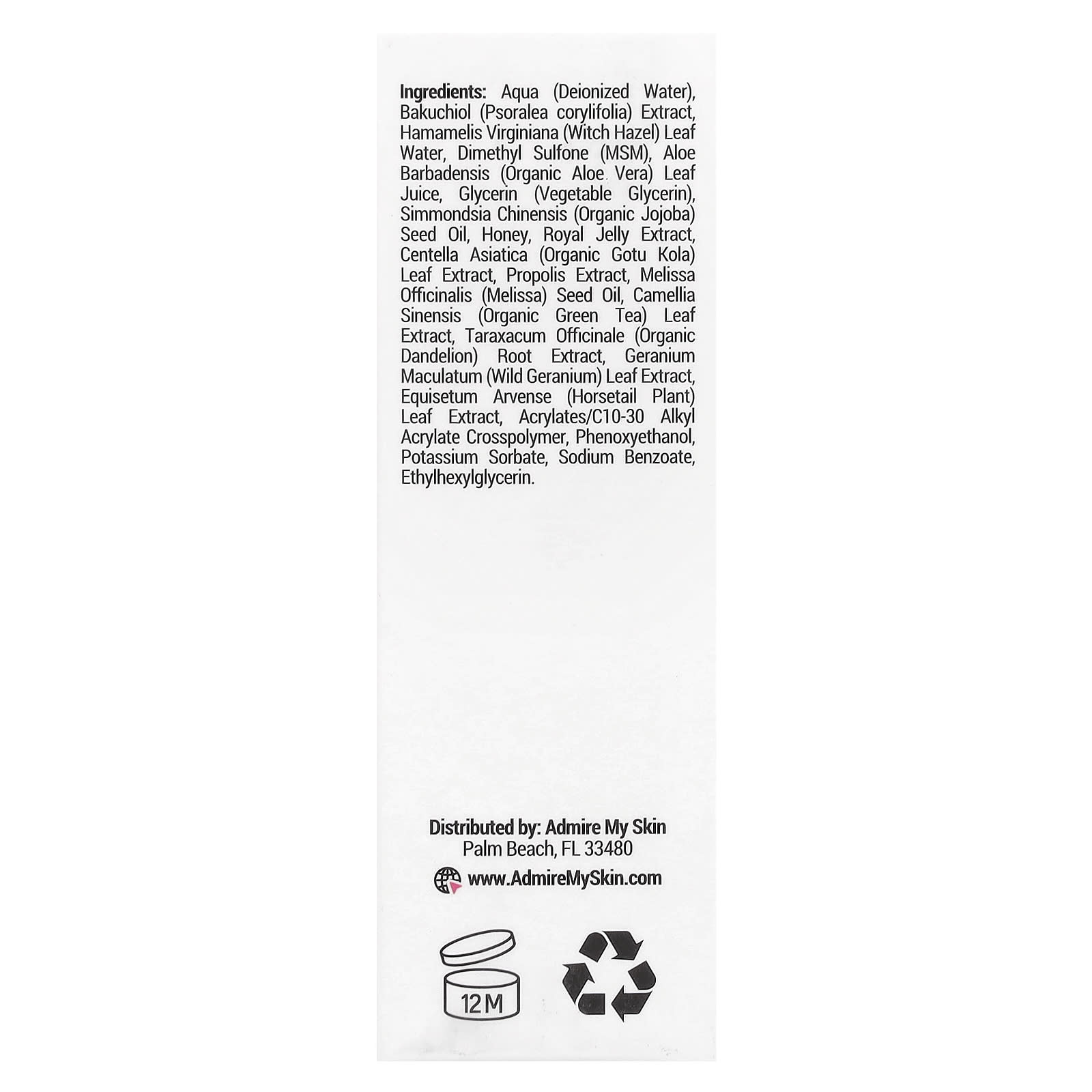 Деионизированная вода (Aqua), экстракт бакучиола (Psoralea corylifolia), вода из листьев гамамелиса (Hamamelis virginiana), диметилсульфон (МСМ), сок листьев алоэ вера (Aloe barbadensis), глицерин (растительный глицерин), масло семян жожоба (Simmondsia chinensis), мед, экстракт маточного молочка, экстракт листьев центеллы азиатской (органическая готу кола), экстракт прополиса, масло семян мелиссы лекарственной (Melissa officinalis), органический экстракт листьев зеленого чая (Camellia sinensis), экстракт корня органического одуванчика (Taraxacum officinale), экстракт листьев дикой герани (Geranium maculatum), экстракт листьев хвоща полевого (Equisetum arvense), акрилат/c10-30 алкил акрилат кроссполимер, феноксиэтанол, сорбат калия, бензоат натрия, этилгексилглицерин.