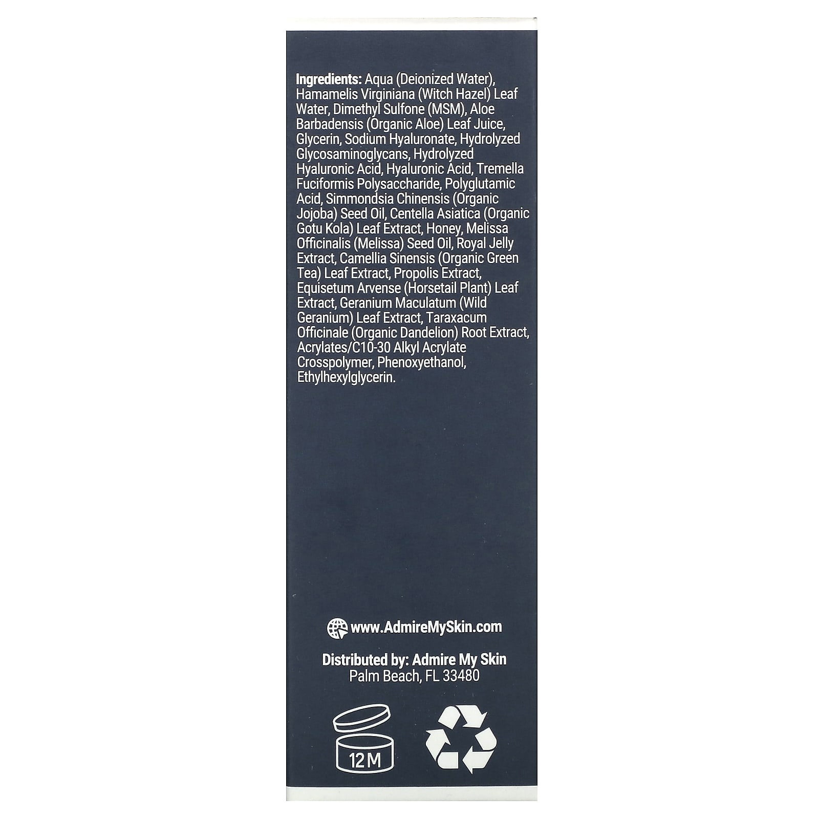 Вода из листьев гамамелиса (Hamamelis virginiana), диметилсульфон (МСМ), сок листьев органического алоэ (Aloe barbadensis), глицерин, гиалуронат натрия, гидролизованные гликозаминогликаны, гидролизованная гиалуроновая кислота, гиалуроновая кислота, полисахарид грибов тремелла (Tremella fuciformis), полиглутаминовая кислота, масло семян жожоба (Simmondsia chinensis), экстракт листьев центеллы азиатской (Organi gotu kola), мед, масло семян мелиссы лекарственной (Melissa officinalis), экстракт маточного молочка, органический экстракт листьев зеленого чая (Camellia sinensis), экстракт прополиса, экстракт листьев хвоща полевого (Equisetum arvense), экстракт листьев дикой герани (Geranium maculatum), экстракт корня органического одуванчика (Taraxacum officinale), акрилаты / кроссполимер C10-30 алкил акрилатов, феноксиэтанол, этилгексилглицерин.