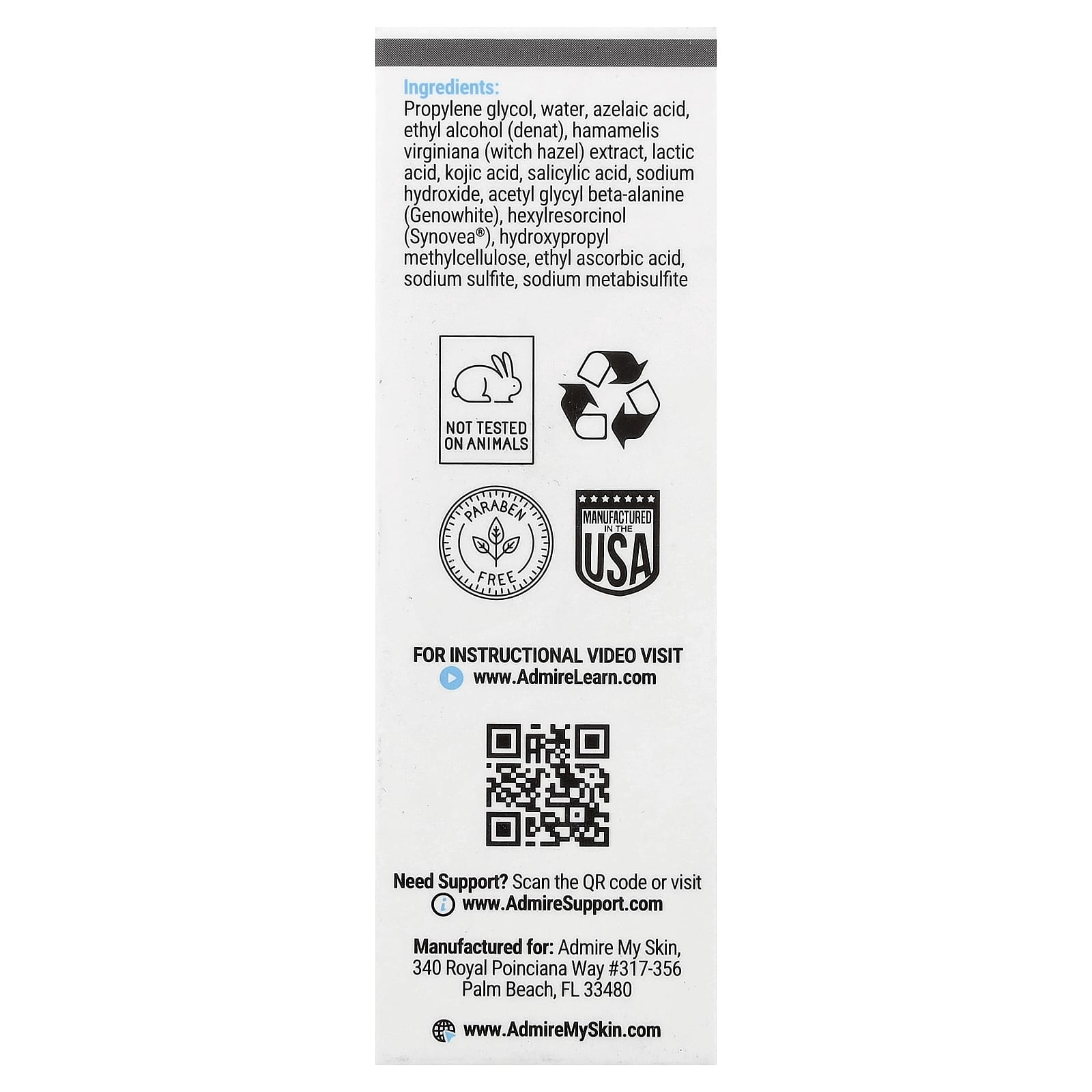 Пропиленгликоль, вода, азелаиновая кислота, этиловый спирт (денат), экстракт гамамелиса (Hamamelis virginiana), молочная кислота, койевая кислота, салициловая кислота, гидроксид натрия, ацетилглицил бета-аланин (genowhite), гексилрезорцин synovea®), гидроксипропилметилцеллюлоза, этил-аскорбиновая кислота, сульфит натрия, метабисульфит натрия.