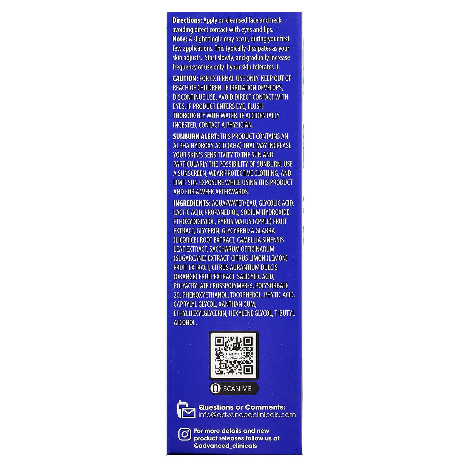 Предупреждение о солнечных ожогах. Данный продукт содержит альфа-гидроксикислоту (АГК), которая может повысить чувствительность кожи к солнечным лучам и вероятность солнечного ожога. Следует использовать солнцезащитный крем, носить закрытую одежду и ограничивать время пребывания на солнце в течение всего времени использования данного продукта и неделю после.