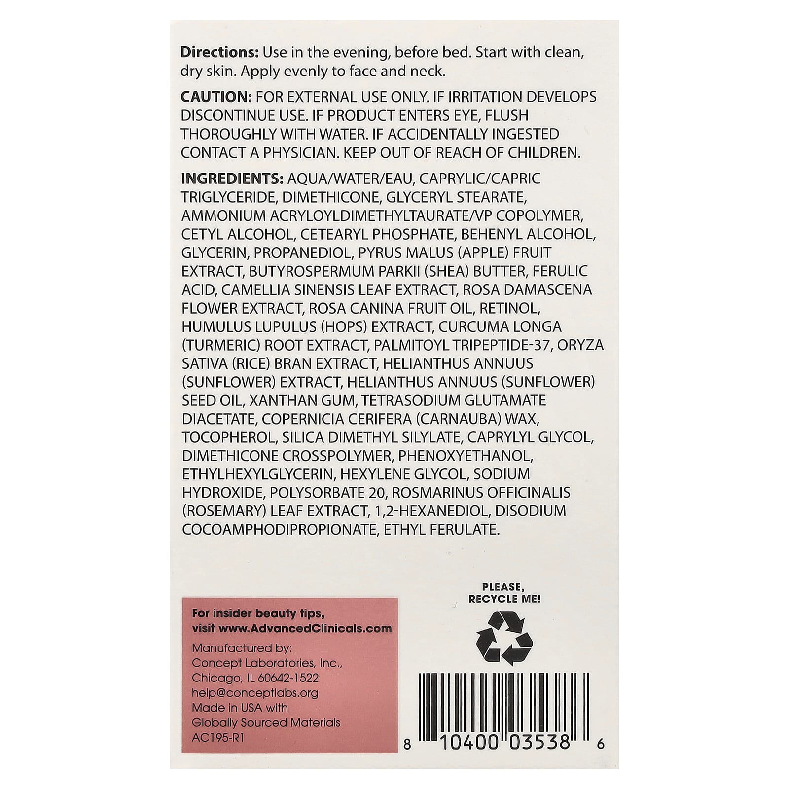Вода, каприловый/каприновый триглицерид, диметикон, глицерил стеарат, аммоний акрилоилдиметилтаурат/ВП сополимер, цетиловый спирт, цетеарил фосфат, бегениловый спирт, глицерин, пропандиол, экстракт яблока (Pyrus malus), Масло Butyrospermum parkii (Ши), феруловая кислота, Экстракт листьев камелии китайской, экстракт цветков дамасской розы (Rosa damascena), масло шиповника (Rosa canina), ретинол, экстракт humulus lupulus (хмеля), экстракт корня куркумы (Curcuma longa), пальмитоил трипептид-37, экстракт рисовых отрубей (Oryza sativa), экстракт подсолнечника (Helianthus annuus), Масло семян подсолнечника, Ксантановая камедь, диацетат глутамата тетранатрия, Воск Copernicia cerifera (Carnauba), Токоферол, диметилсилат диоксида кремния, каприлилгликоль, Диметикон кроссполимер, феноксиэтанол, этилгексилглицерин, гексиленгликоль, гидроксид натрия, полисорбат 20, Экстракт листьев розмарина, 1,2-гександиол, динатрия кокоамфодипропионат, этил ферулат.