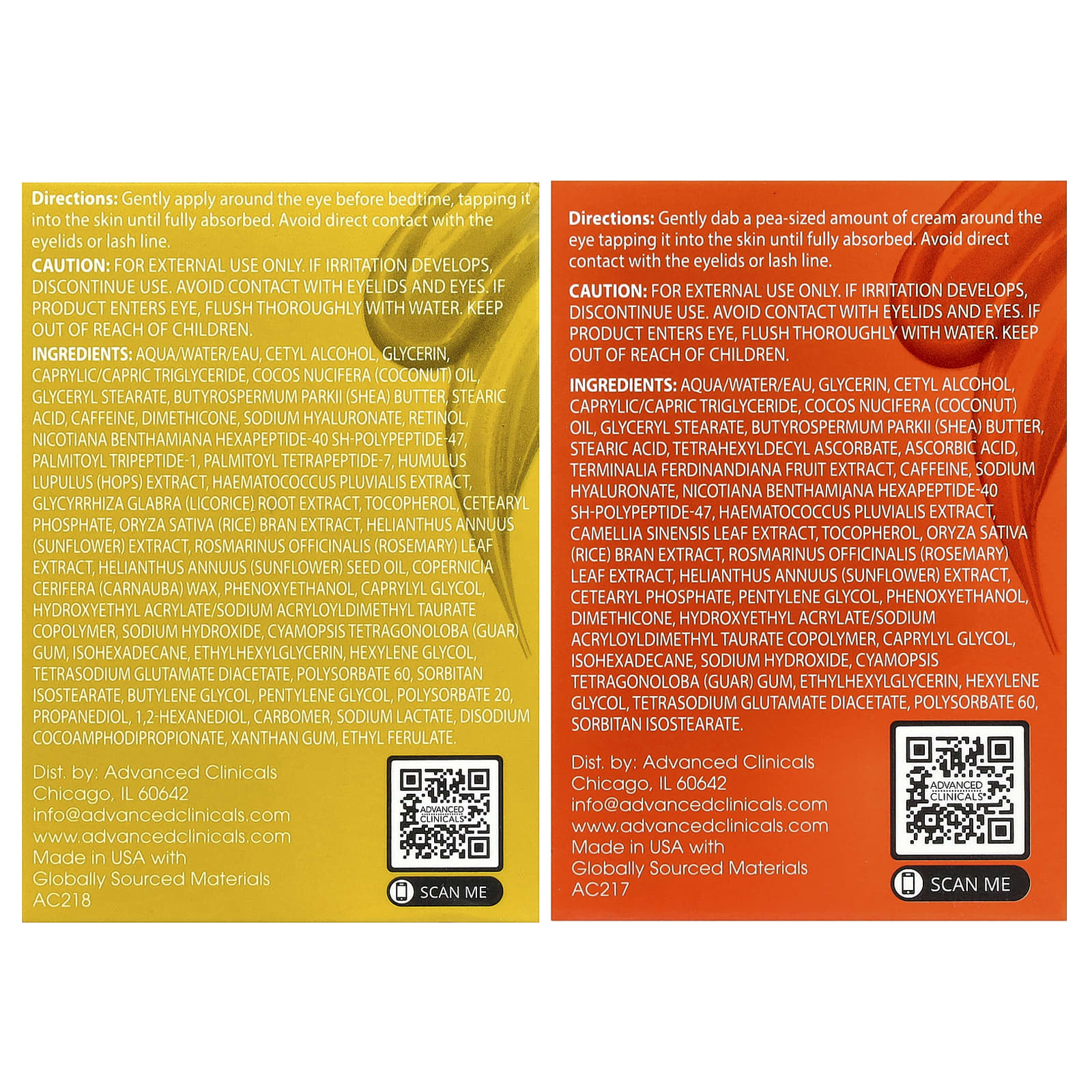 Укрепляющий крем для области вокруг глаз с ретинолом и пептидами: Вода (Aqua/eau), цетиловый спирт, глицерин, каприловый/каприновый триглицерид, кокосовое масло (Cocos nucifera), глицерил стеарат, масло ши (Butyrospermum parkii), стеариновая кислота, кофеин, диметикон, гиалуронат натрия, ретинол, гексапептид-40 sh-полипептид-47 пальмитоил трипептид-1, пальмитоил тетрапептид-7, экстракт хмеля (Humulus lupulus), экстракт гематококка дождевого (Haematococcus pluvialis), экстракт корня солодки (Glycyrrhiza glabra), токоферол, цетеарил фосфат, экстракт рисовых отрубей (Oryza sativa), экстракт подсолнечника (Helianthus annuus), экстракт листьев розмарина (Rosmarinus officinalis), подсолнечное масло (Helianthus annuus), карнаубский воск (Copernicia cerifera), феноксиэтанол, каприлилгликоль, гидроксиэтил акрилат/натрия акрилоилдиметилтаурата сополимер, гидроксид натрия, гуаровая камедь (Cyamopsis tetragonoloba), изогексадекан, этилгексилглицерин, гексиленгликоль, диацетат глутамата тетранатрия, полисорбат 60, сорбитан изостеарат, бутиленгликоль, пентилен гликоль, полисорбат 20, пропандиол, 1,2-гександиол, карбомер, лактат натрия, динатрия кокоамфодипропионат, ксантановая камедь, этил ферулат.