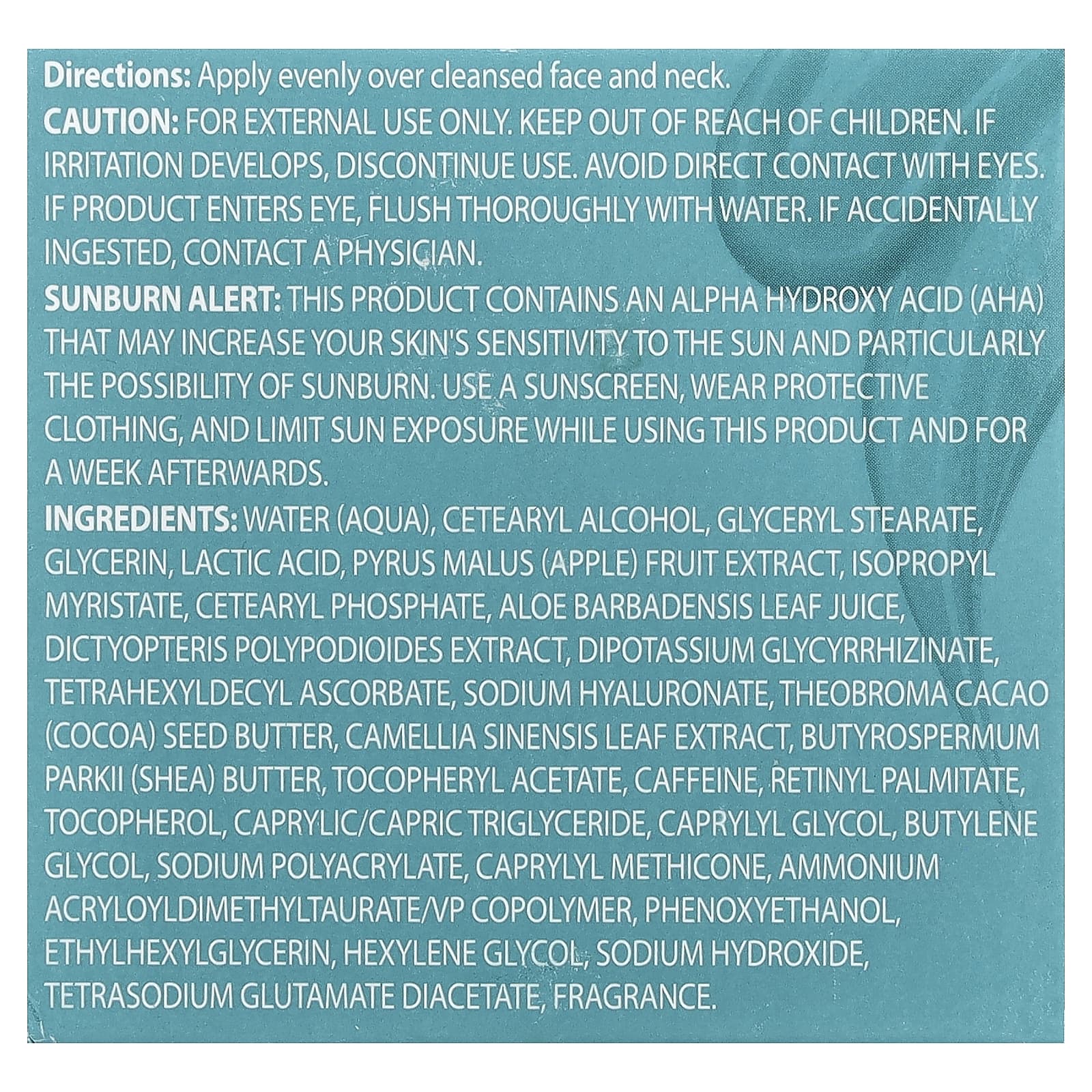 Вода, Цетеариловый спирт, глицерил стеарат, глицерин, молочной кислоты, экстракт яблока (Pyrus malus), изопропил миристат, цетеарил фосфат, сок листьев алоэ вера (Aloe barbadensis), экстракт готу колы (Dictyopteris Polypodioides), дикалия глицирризинат, тетрагексилдецил аскорбат, гиалуронат натрия, масло зерен какао (Theobroma cacao), Экстракт листьев камелии китайской, Масло Butyrospermum parkii (Ши), токоферилацетат, кофеин, ретинилпальмитат, Токоферол, каприловый/каприновый триглицерид, каприлилгликоль, бутиленгликоль, полиакрилат натрия, каприлилметикон, аммоний акрилоилдиметилтаурат/ВП сополимер, феноксиэтанол, этилгексилглицерин, гексиленгликоль, гидроксид натрия, диацетат глутамата тетранатрия, аромат.