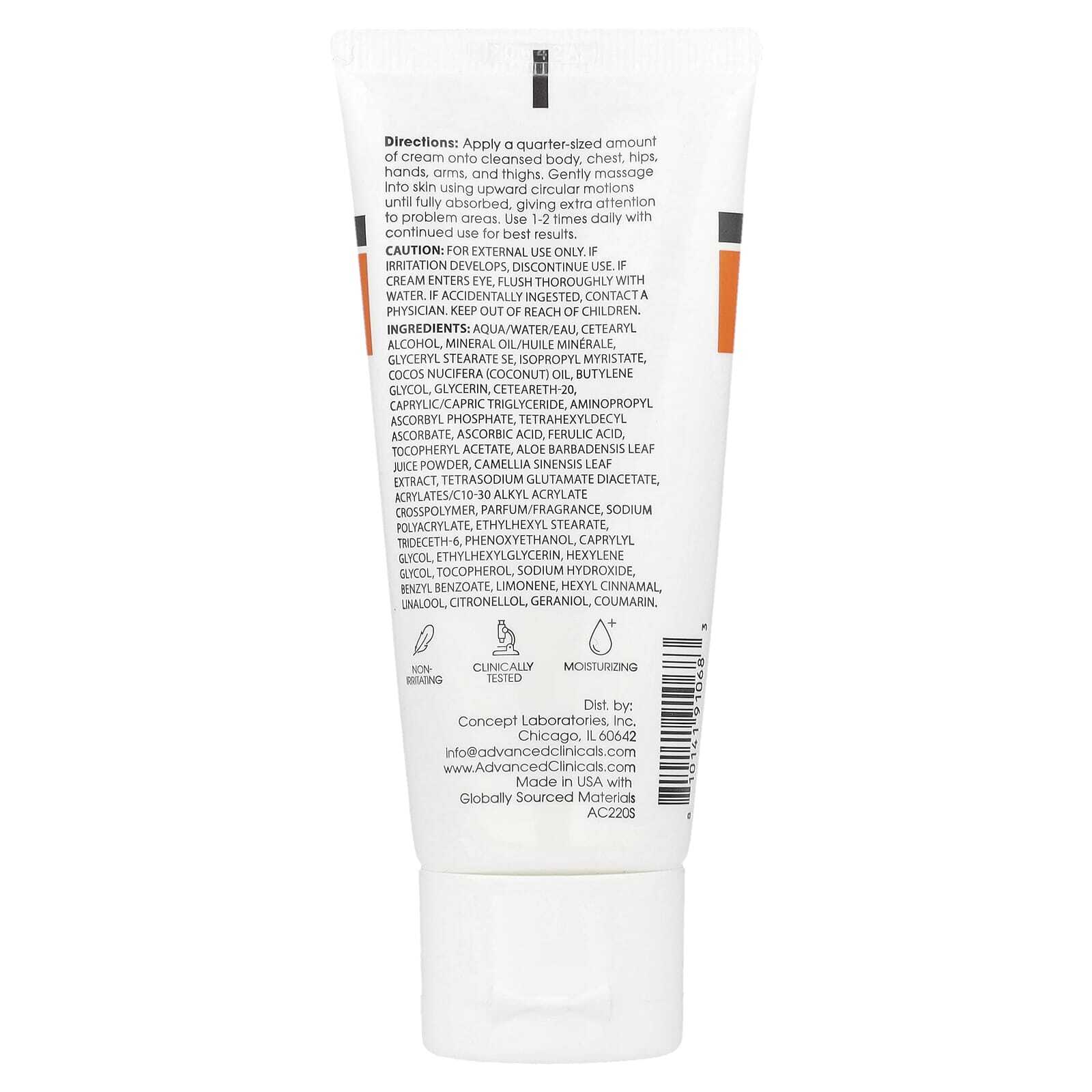 Вода, цетеариловый спирт, минерального масла, глицерил стеарат эмульгирующий, изопропил миристат, кокосовое масло (Cocos nucifera), бутиленгликоль, глицерин, цетеарет-20, каприловый/каприновый триглицерид, аминопропил аскорбил фосфат, тетрагексилдецил аскорбат, аскорбиновая кислота, феруловая кислота, токоферилацетат, порошок из сока листьев алоэ вера (Aloe barbadensis), экстракт листьев зеленого чая (Camellia sinensis), диацетат глутамата тетранатрия, акрилат/c10-30 алкил акрилат кроссполимер, парфюмерная композиция/отдушка, полиакрилат натрия, этилгексил стеарат, тридецет-6, феноксиэтанол, каприлилгликоль, этилгексилглицерин, гексиленгликоль, токоферол, гидроксид натрия, бензилбензоат, лимонена, гексил циннамал, линалоол, цитронеллола, гераниола, кумарин.