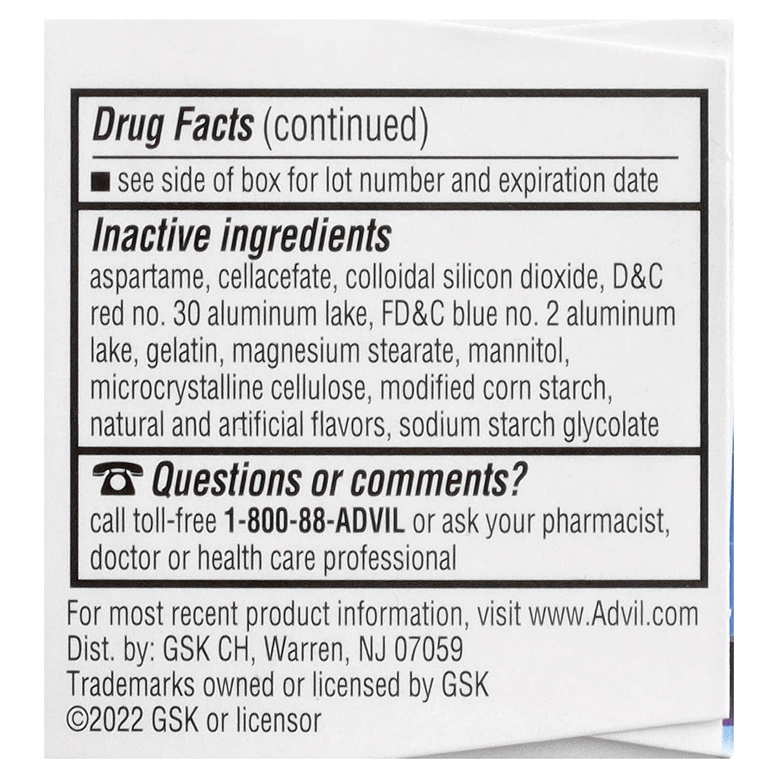 | Аспартам, целлацефат, коллоидный диоксид кремния, D&C красный № 30 Aluminium Lake, синий FD&C 2 лака алюминия, желатин, стеарат магния, маннит, микрокристаллическая целлюлоза, модифицированный кукурузный крахмал, натуральные и искусственные ароматизаторы, натрия гликолят крахмала. | |