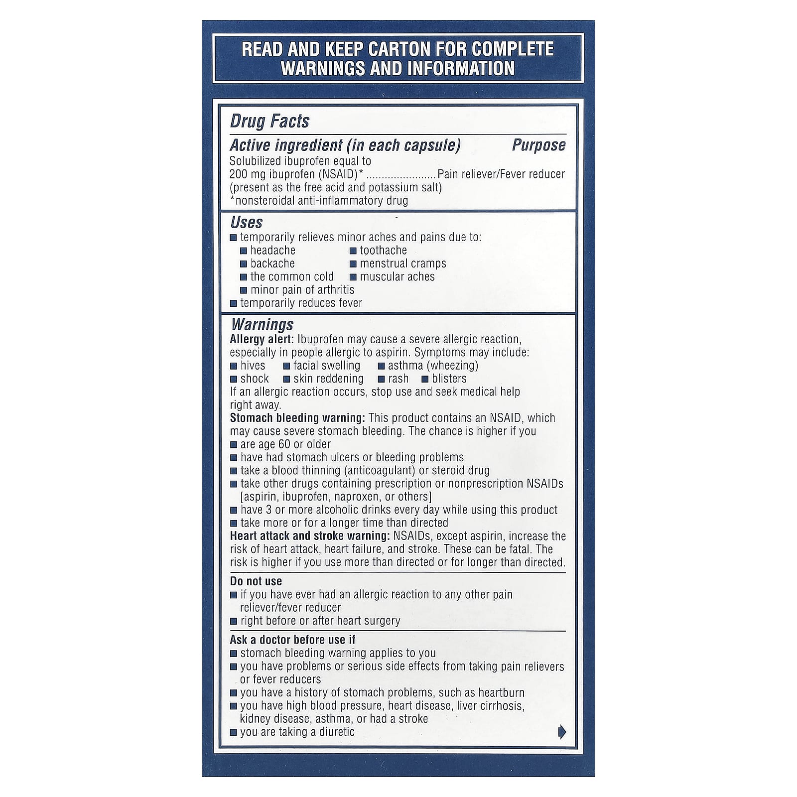 | Растворенный ибупрофен, эквивалентный 200 мг ибупрофена (НПВП)* (в виде свободной кислоты и калийной соли) * Нестероидный противовоспалительный препарат | Уменьшение болевых ощущений и снижение температуры |