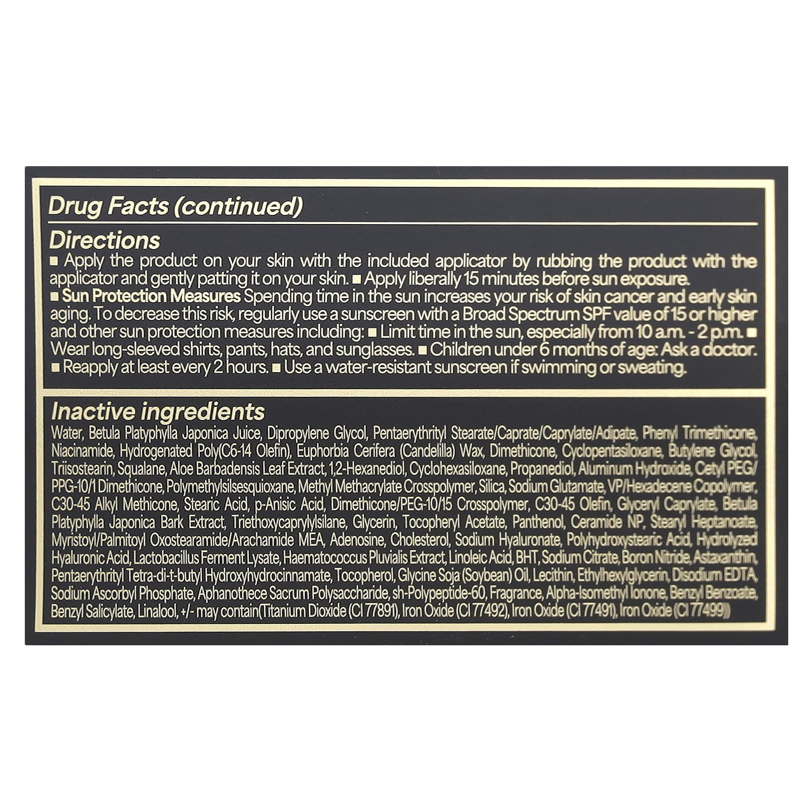 Вода, сок Betula platyphylla japonica, дипропиленгликоль, пентаэритритил стеарат / капрат / каприлат / адипат, фенилтриметикон, никотинамид, гидрогенизированный поли (С6-14 олефин), канделильский воск, диметикон, циклопентасиленгликоль, диметикон, циклопентасиленгликоль , экстракт листьев алоэ барбаденсис, 1,2-гександиол, циклогексасилоксан, пропандиол, гидроксид алюминия, цетил ПЭГ / ППГ-10/1 диметикон, полиметилсилсесквиоксан, метилметакрилат кроссполимер, диоксид кремния, натрия глутамат, вполимер / гексадецен сополимер , стеариновая кислота, пара-анисовая кислота, кроссполимер диметикон / ПЭГ-10/15, олефин c30-45, глицерил каприлат, экстракт коры бетулы платифиллы японской, триэтоксикаприлилсилан, глицерин, токоферилацетат, пантенол, церамидгептано / нп, пальмитоид нп, стеарилгептаноат оксостеарамид / арахамид, аденозин, холестерин, гиалуронат натрия, полигидроксистеариновая кислота, гидролизованная гиалуроновая кислота, ферментный лизат лактобактерий, гематококк плювиальный экстракт s, линолевая кислота, БГТ, цитрат натрия, нитрид бора, астаксантин, пентаэритритил тетра-ди-трет-бутил гидроксигидроциннамат, токоферол, соевое масло (глицин соя), лецитин, этилгексилглицерин, динатриевая соль эдтацеи, аскорбилфосфат натрия, sh-полипептид-60, отдушка, альфа-изометилионон, бензилбензоат, бензил салицилат, линалоол, +/- может содержать (диоксид титана (CI 77891), оксид железа (CI 77492), оксид железа (CI 77491), оксид железа (CI 77499).