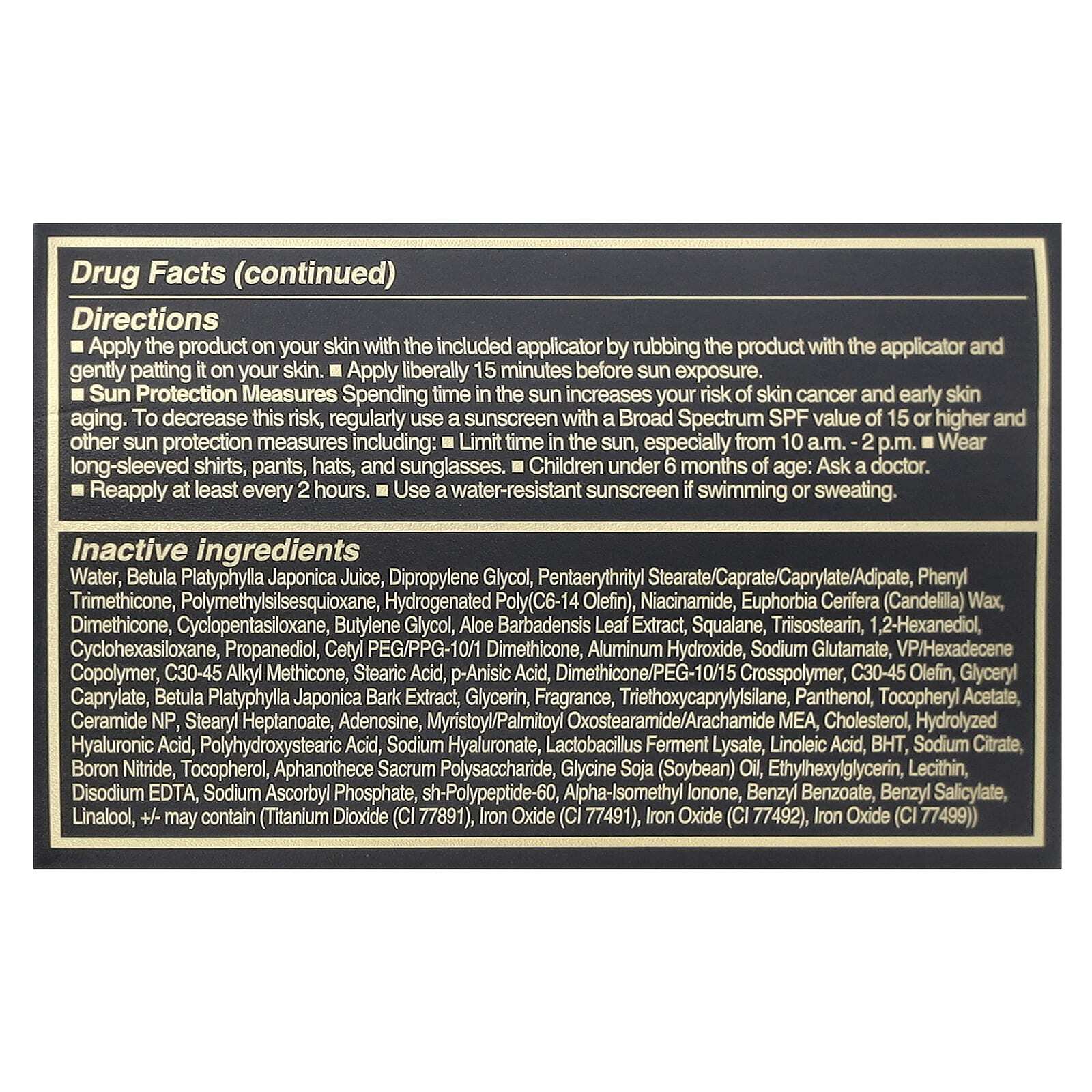| Вода, сок Betula platyphylla japonica, дипропиленгликоль, пентаэритритил стеарат / капрат / каприлат / адипат, фенилтриметикон, полиметилсилсесквиоксан, гидрогенизированный поли (c6-14 олефин), ниацинамид, эуфорбия церифераан (канделиленгликоль), воск, диптиленгликоль (Euphorbia cerifera) barbadensis, сквалан, триизостеарин, 1,2-гександиол, циклогексасилоксан, пропандиол, цетил ПЭГ / ППГ-10/1 диметикон, гидроксид алюминия, глутамат натрия, сополимер ВП / гексадецена, С30-45 алкилметикон, стеариновая кислота, п- анисовая кислота, диметикон / ПЭГ-10/15 кроссполимер, c30-45 олефин, глицерил каприлат, экстракт коры бетулы платифиллы японской, глицерин, отдушка, триэтоксикаприлилсилан, пантенол, токоферилацетат, церамид нп, стеарил оксиденозатин, стеарилгептаноат арахамидное вещество, холестерин, гидролизованная гиалуроновая кислота, полигидроксистеариновая кислота, гиалуронат натрия, ферментный лизат лактобактерий, линолевая кислота, бета-гидрокситамин, цитрат натрия, нитрид бора, toc оферол, полисахарид Aphanothece sacrum, соевое масло (глицин соя), этилгексилглицерин, лецитин, динатрий ЭДТА, аскорбилфосфат натрия, sh-полипептид-60, альфа-изометиллонон, бензилбензоат, бензил салицилат, линалоол (титан +/- может содержать диоксид (CI 77891), оксид железа (CI 77491), оксид железа (CI 77492), оксид железа (CI 77499). | |