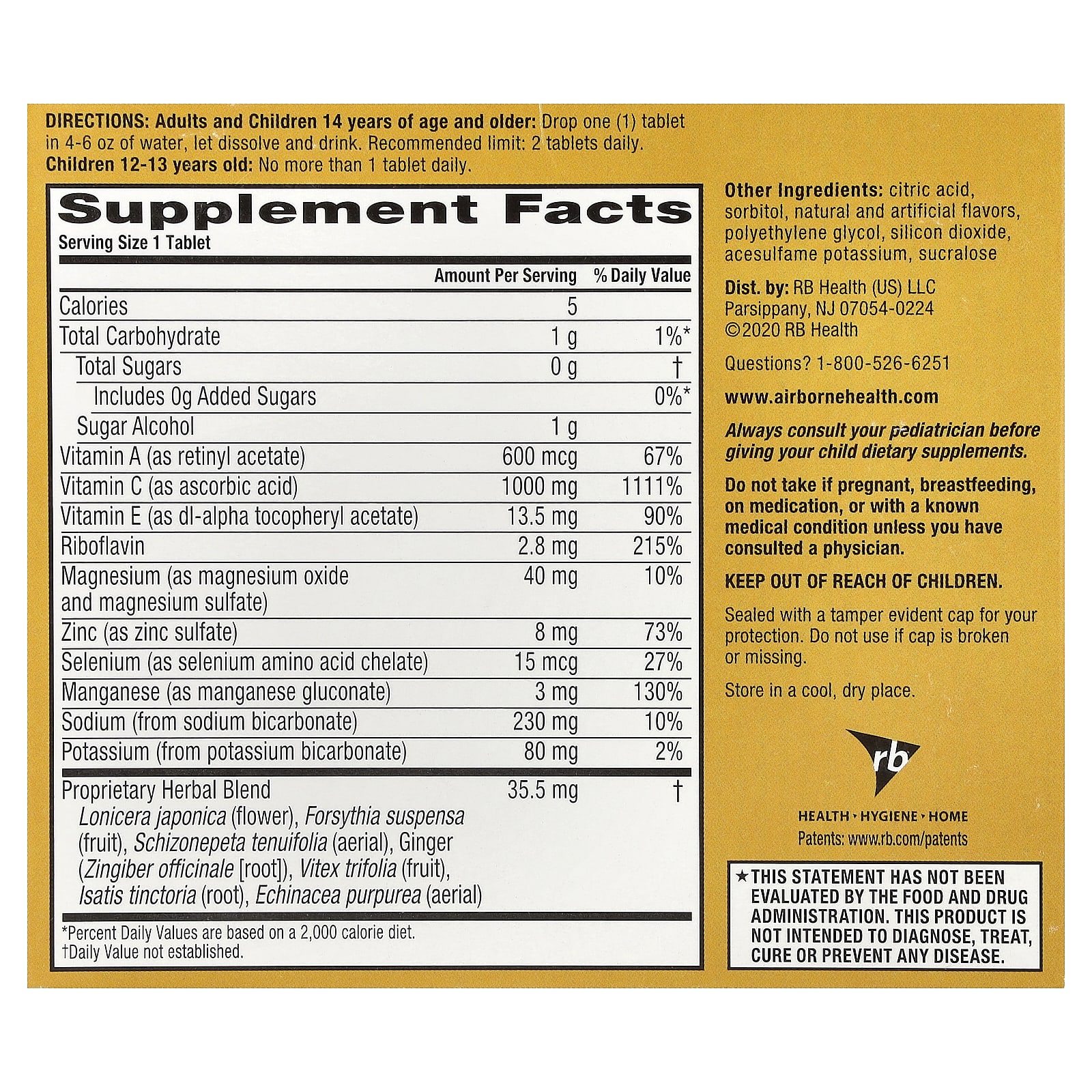 | Запатентованная травяная смесь Lonicera japonica (цветки), Forsythia suspensa (плоды), Schizonepetatenuifolia (надземные части), имбирь (Zingiber officinale [корень]), Vitex trifolia (плоды), Isatis tinctoria (корень), эхинацея пурпурная (Echinacea purpurea) (надземные части) | 35,5 мг | † |