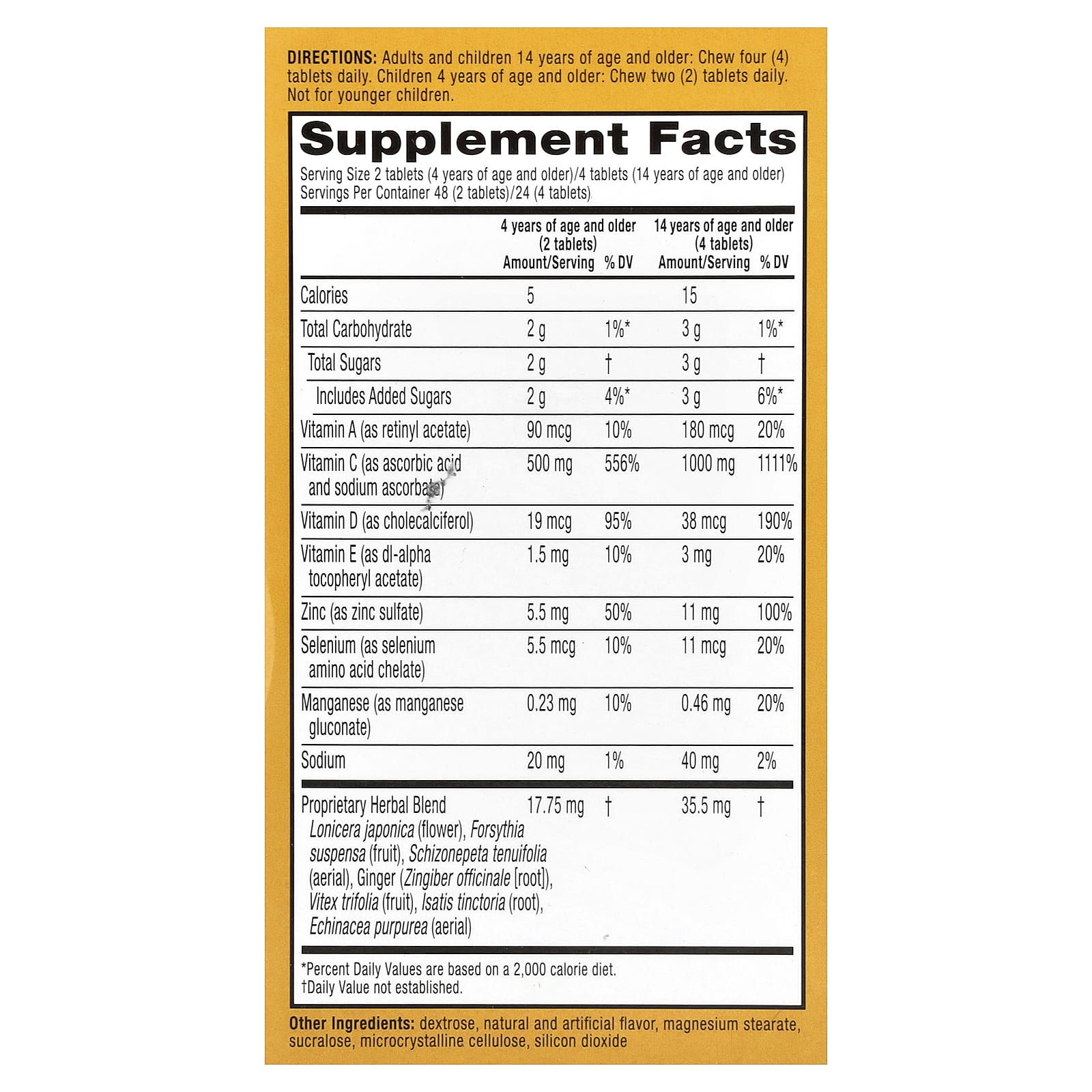 Взрослым и детям от 14 лет и старше принимать четыре (4) таблетки в день. Детям 4 лет и старше разжевывать по две (2) таблетки в день. Не предназначено для детей младшего возраста.