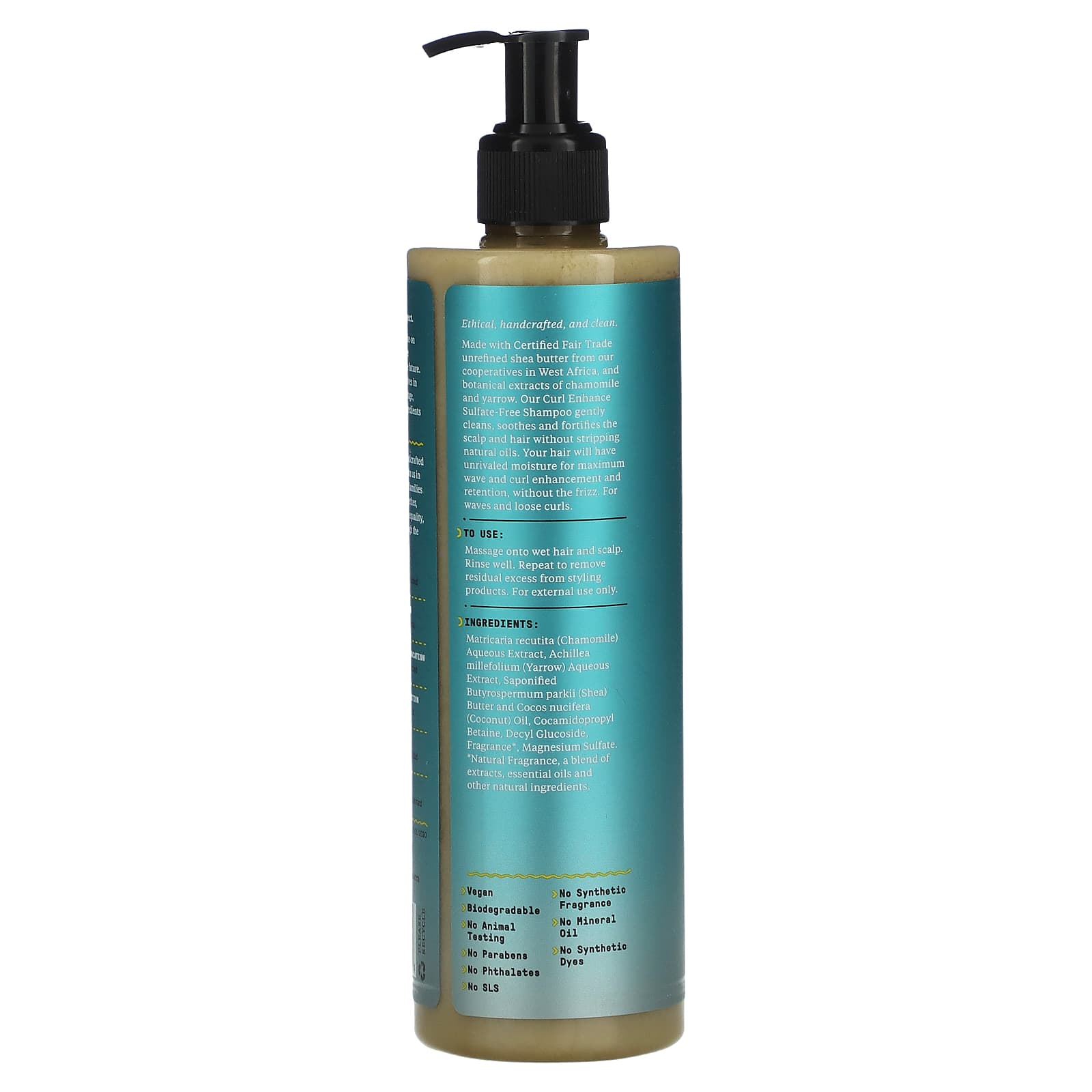 Изготовлено из нерафинированного масла ши, сертифицированного и закупленного на основе принципов справедливой торговли в наших кооперативах в Западной Африке, и растительных экстрактов ромашки и тысячелистника. Наш шампунь Curl Enhance без сульфатов мягко очищает, успокаивает и укрепляет кожу головы и волосы, сохраняя липидный слой. Ваши волосы получат непревзойденное увлажнение для сохранения локонов и кудрей без пушения. Для волнистых и распущенных локонов.