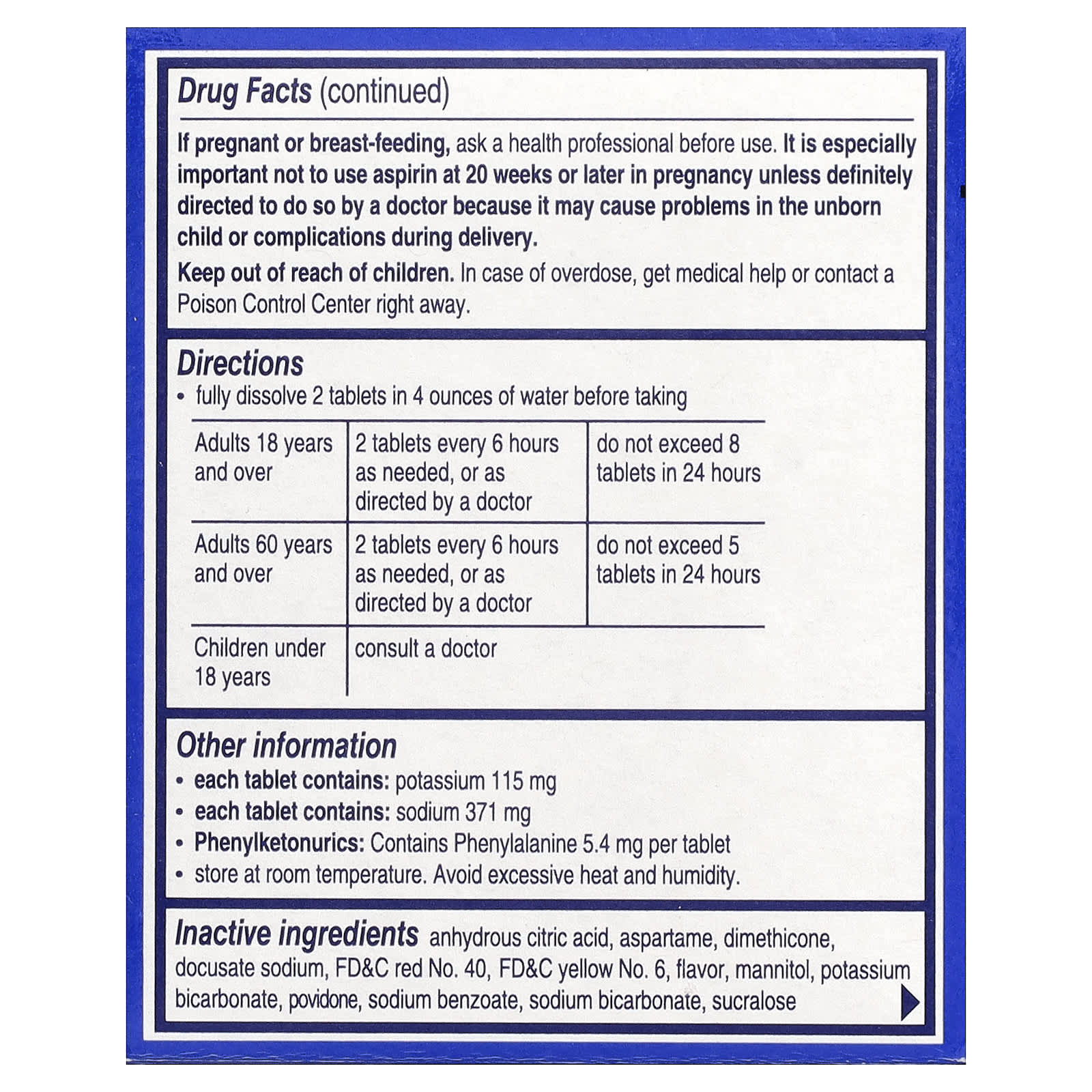 | Неактивные ингредиенты: безводная лимонная кислота, аспартам, диметикон, докузат натрия, краситель красный 40 FD&C, краситель желтый 6 FD&C, ароматизатор, маннит, бикарбонат калия, повидон, бензоат натрия, бикарбонат натрия, сукралоза. Каждая таблетка содержит:Калий - 115 мг Каждая таблетка содержит:371 мг натрия Фенилкетонурия. Содержит фенилаланин 5,4 мг в одной таблетке. | |