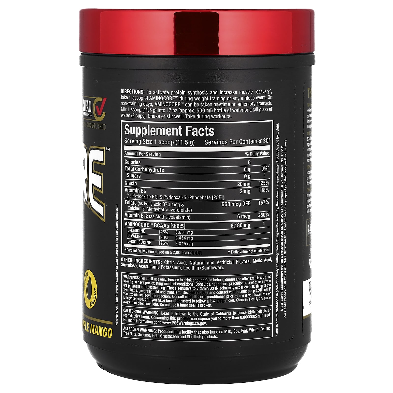 Зачем использовать ALLMAX AMINOCORE? — Не все BCAA одинаковы. AMINOCORE содержит 8,18 г BCAA в клинически подтвержденном соотношении 9:6:5, которое обеспечивает усиление активации сигналов мышечного роста на 350%. Благодаря использованию чистого источника BCAA в свободной форме, AMINOCORE не содержит наполнителей или аминокислот, не относящихся к BCAA. BCAA AMINOCORE 9:6:5 очищаются и проверяются перед добавлением ароматизаторов, чтобы не содержать примесей, которые могут привести к помутнению, масляной пене, осадку и, что самое неприятное, к резкому горькому вкусу! Aminocore — это чистая и вкусная добавка с BCAA, которую можно купить за деньги!