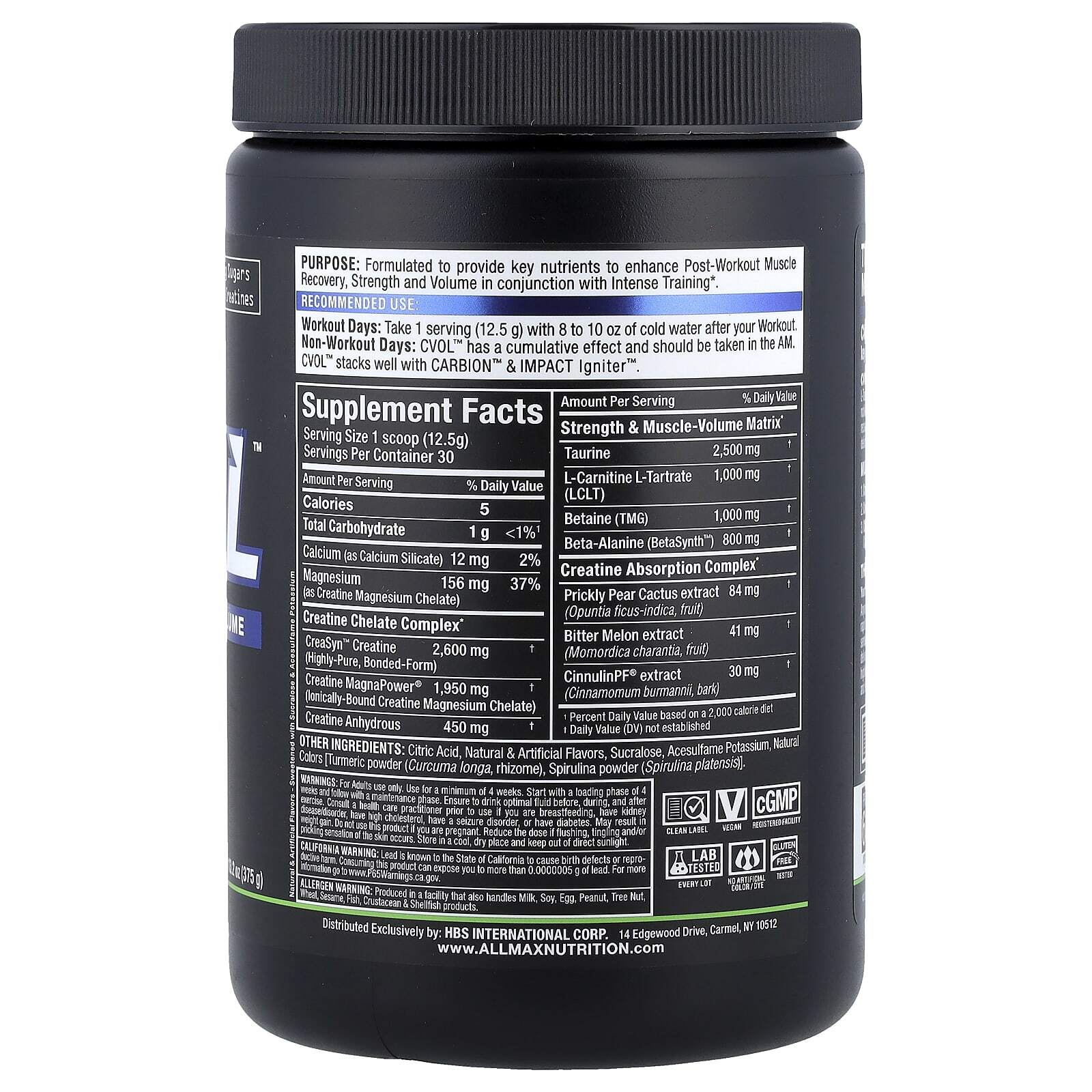CVOL™ содержит 5 г нашего комплекса хелатного креатина, 2,5 г L-таурина, 1 г L-карнитина L-тартрата, 1 г бетаина и 800 мг бета-аланина. этот список незаменимых ингредиентов, дозированных в эффективных дозах для быстрого восстановления после интенсивных тренировок. CVOL подходит для вашей тренировки. Это восхитительный продукт, на 100% не содержащий сахара и почти не содержащий углеводов.