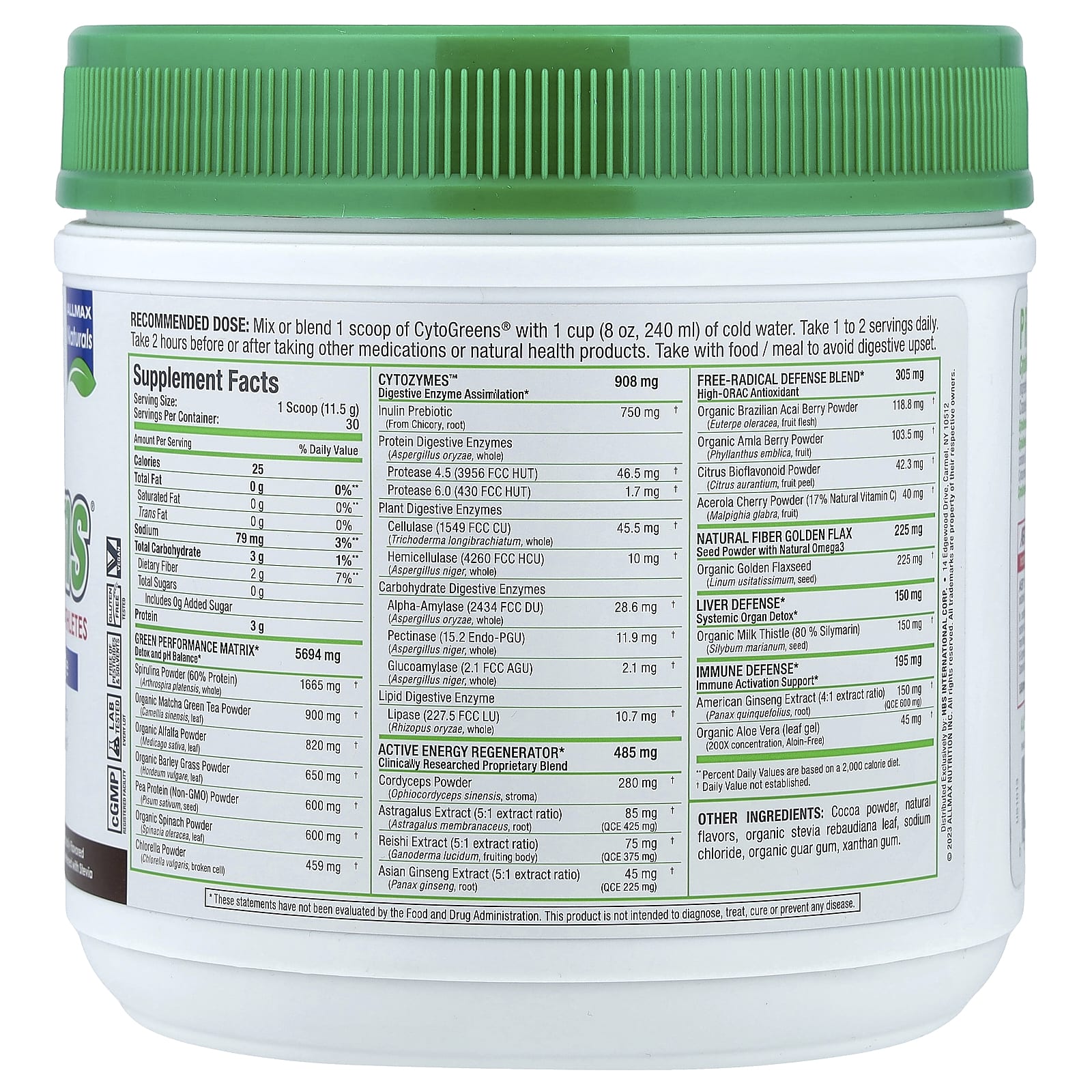 CytoGreens® содержит более 300 мг стандартизированных антиоксидантов с высоким уровнем ORAC, нейтрализующих свободные радикалы (1,2 г с учетом нашего зеленого чая матча). Она также содержит Cytozymes, специальную высокоэффективную смесь 8 ферментов, которая в 20 раз Ферментная активность лучших добавок с зеленью Цитозимы помогают расщеплять необработанные цельнопищевые ингредиенты, чтобы высвобождать питательные вещества для оптимального пищеварения и биодоступности.