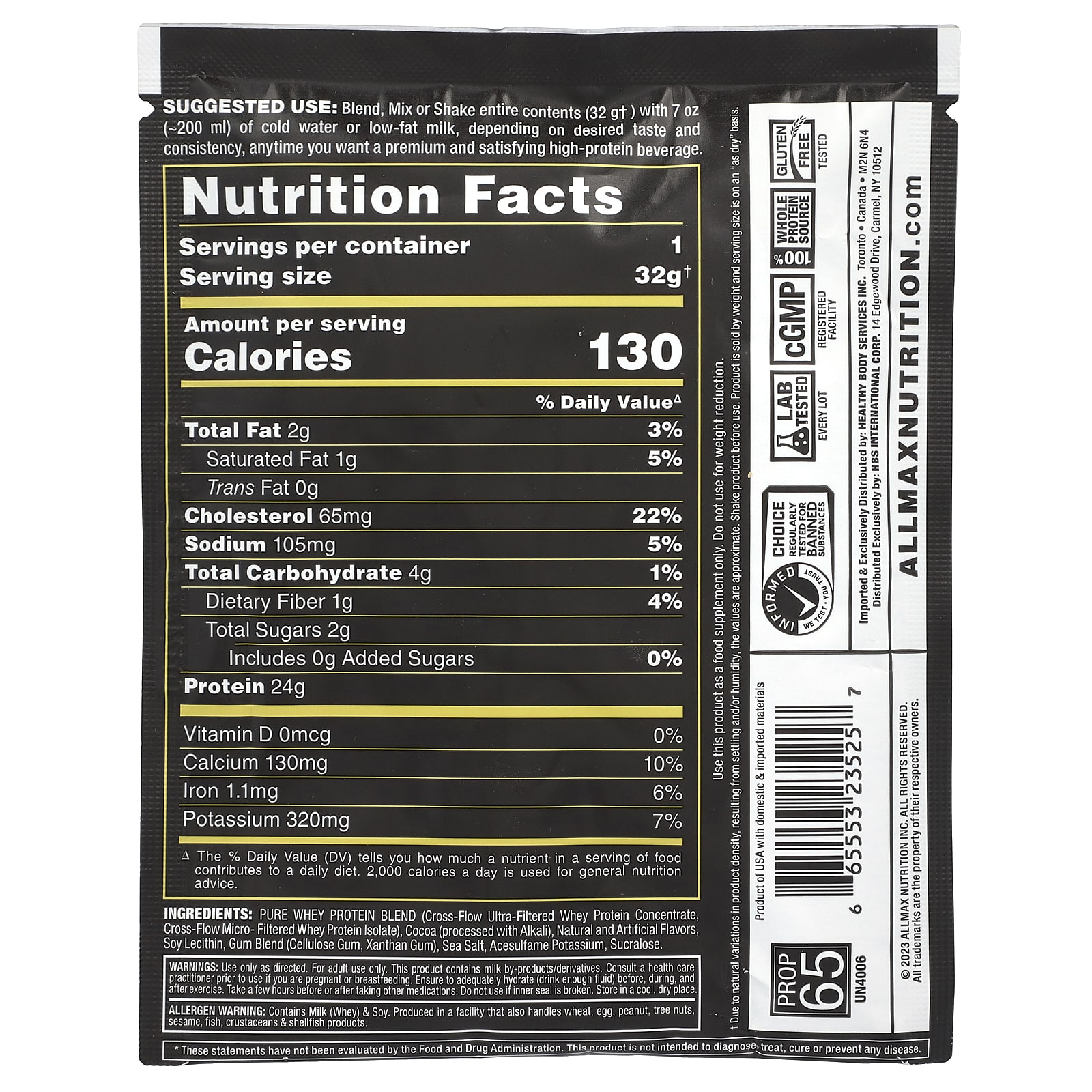 Предупреждение об аллергенах. Содержит молоко (сыворотку) сои. Изготовлено на предприятии, где также обрабатываются пшеница, яиц, арахис, древесные орехи, кунжут, рыба, ракообразные и и м)оллюски.