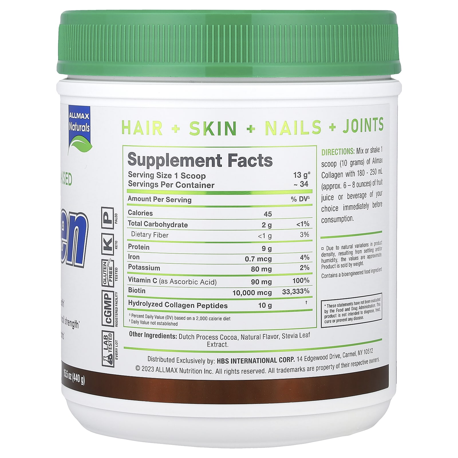 Коллагеновый белок ALLMAX травяного откорма и выращенный на пастбище получен из пептидов гидролизованного коллагенового белка (типа I, II и III). Коллаген необходим для производства соединительной ткани и обеспечивает здоровье суставов, волос, ногтей и кожи. Коллаген ALLMAX также имеет дополнительное преимущество — биотин для дополнительной поддержки в формировании здоровых волос, ногтей и кожи, а также витамин С в качестве источника антиоксидантов.