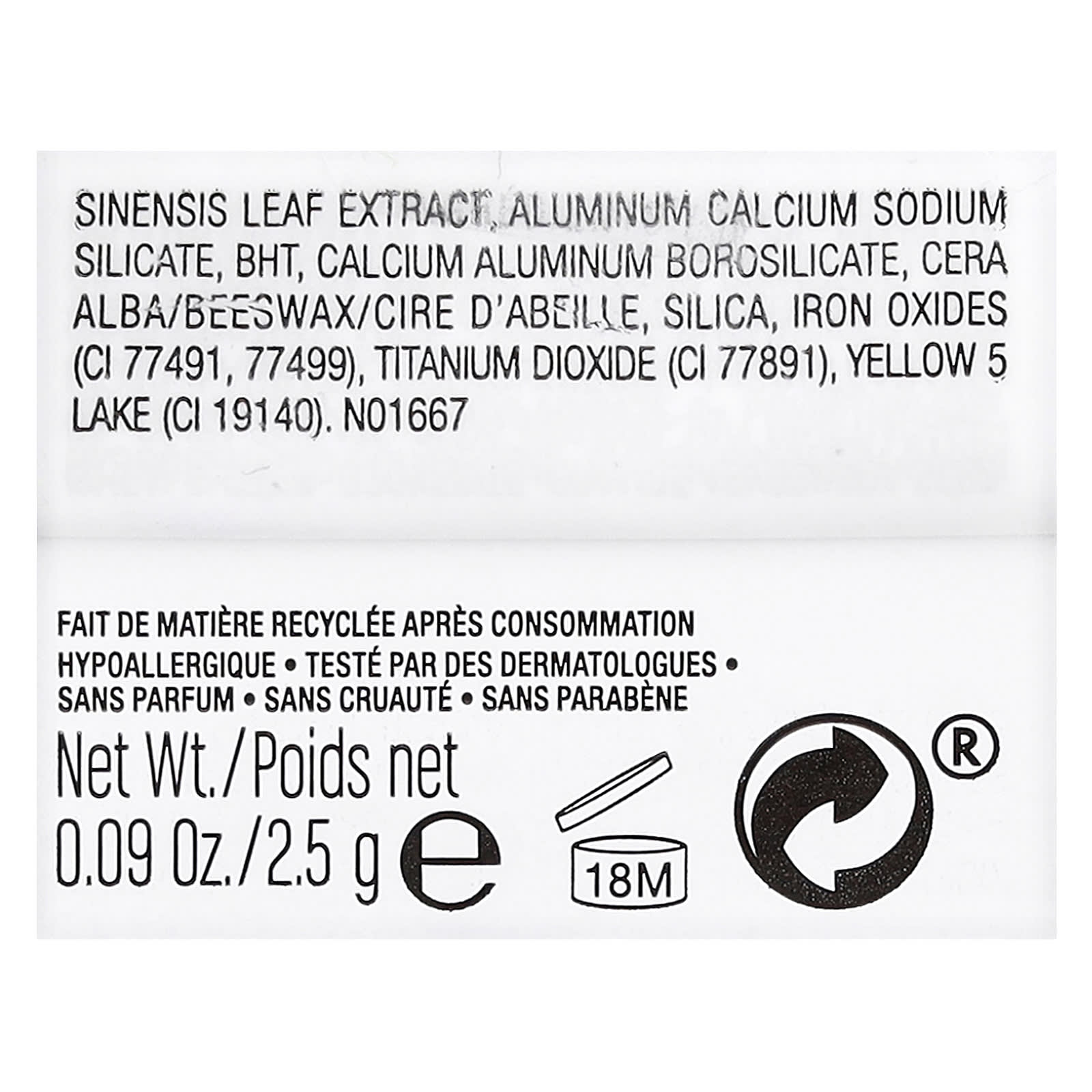 Экстракт листьев sinensis, силикат алюминия, кальция и натрия, бутилгидрокситолуол, кальций алюминий боросиликат, белая шея (Cera alba), пчелиный воск, апельсин (Cire d'abeille), диоксид кремния, оксиды железа (CI 77491, 77499), диоксид титана (CI 77891), краситель желтый 5 лак (CI 19140)