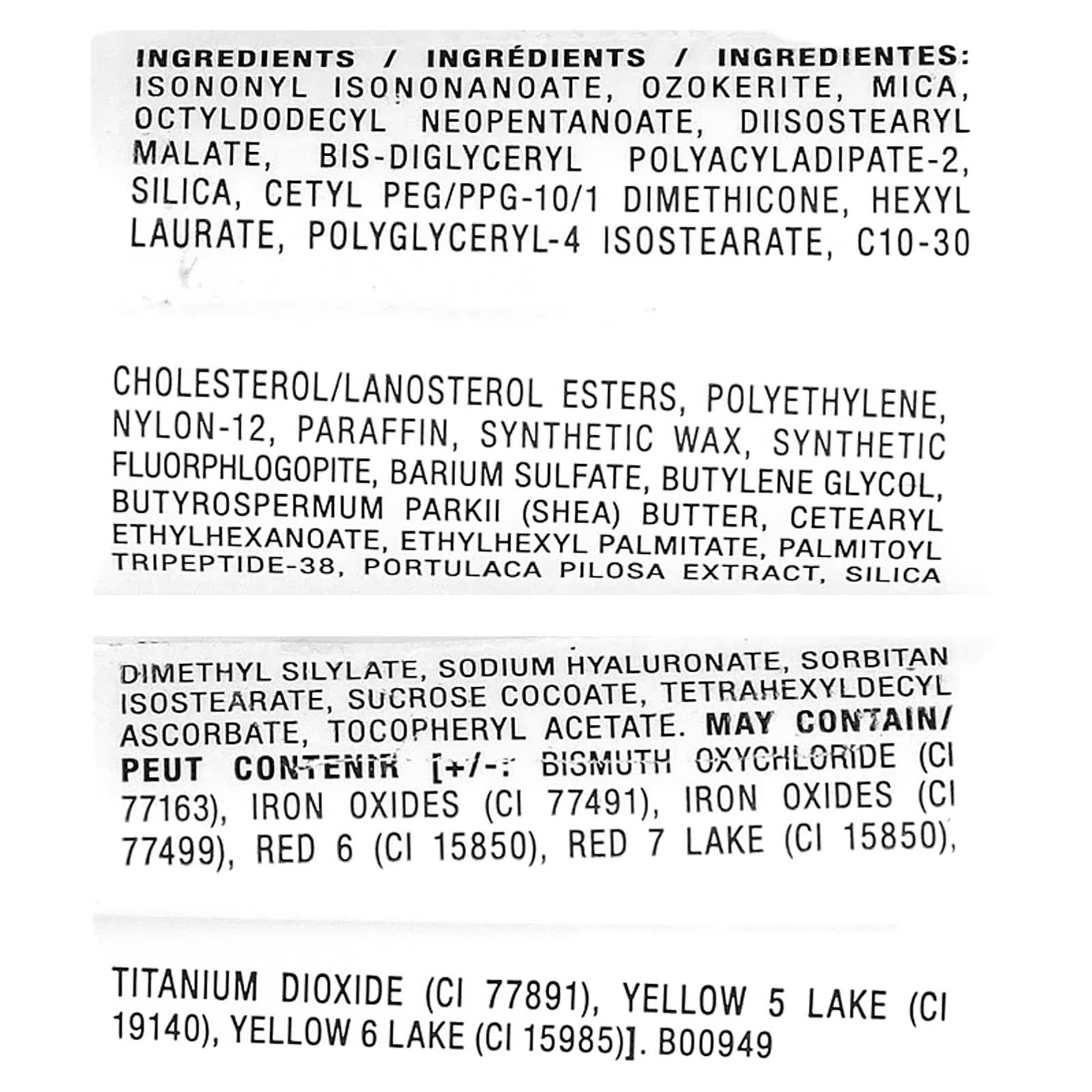 Изононил изононаноат, озокерит, слюда, октилдодецил неопентаноат, диизостеарил малат, бис-диглицерил полиациладипат-2, диоксид кремния, цетил ПЭГ/ППГ-10/1 диметикон, гексил лаурат, полиглицерил-4 изостеарат, c10-30, эфиры холестерина/ланостерола, полиэтилен, нейлон-12, парафина, синтетический воск, синтетический фторфлогопит, сульфат бария, бутиленгликоль, масло ши (Butyrospermum parkii), цетеариловый этилгексаноат, этилгексил пальмитат, пальмитоил трипептид-38, экстракт портулака волосистого (Portulaca pilosa), диоксид кремния, диметил силилат, гиалуронат натрия, сорбитан изостеарат, кокоат сахарозы, тетрагексилдецил аскорбат, токоферилацетат. может содержать оксихлорид висмута (CI 77163), оксиды железа (CI 77491), оксиды железа (CI 77499), краситель красный 6 (CI 15850), краситель красный 7 лак (CI 15850), диоксид титана (CI 77891), краситель желтый 5 лак (CI 19140), краситель желтый 6 лак (CI 15985)].