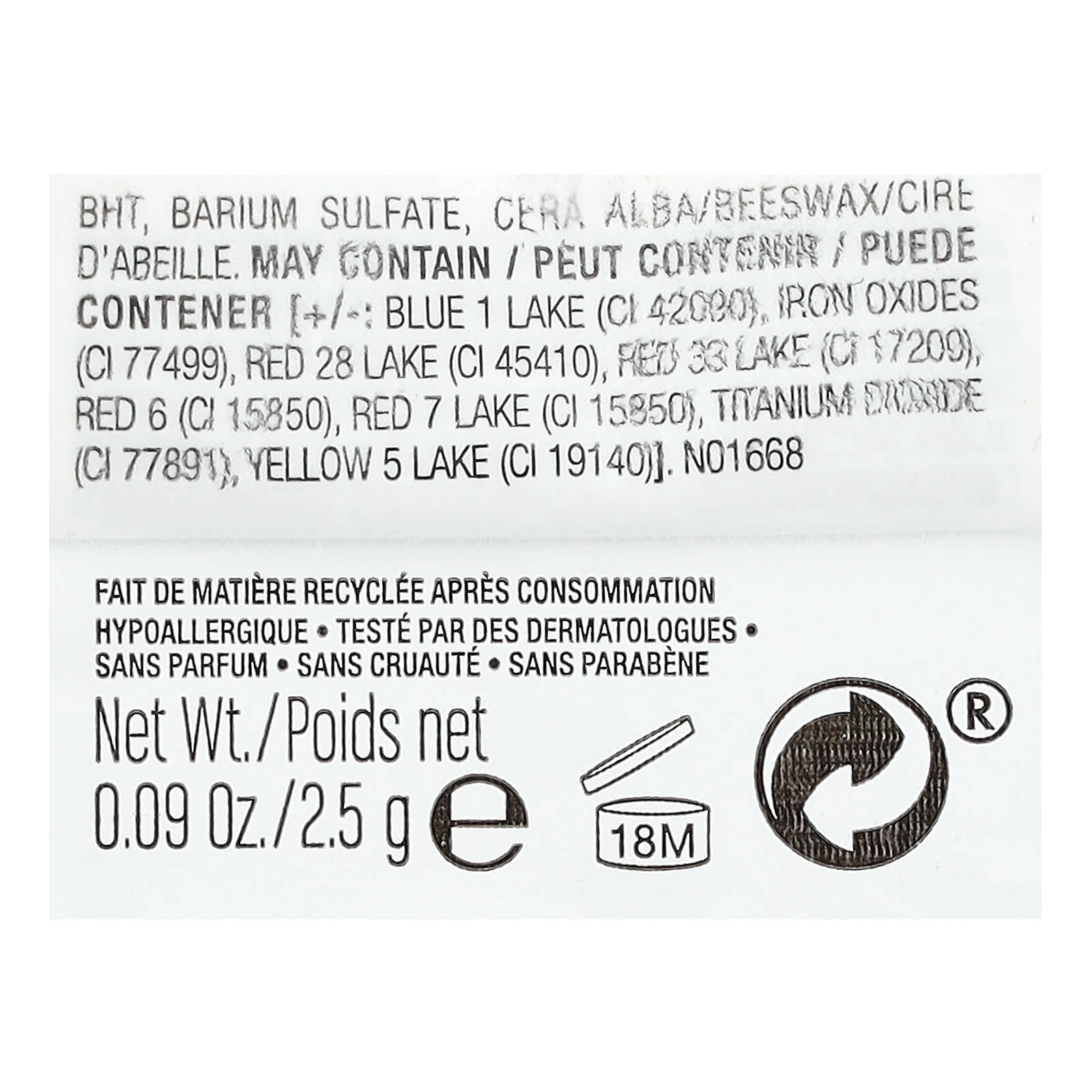 Bht, сульфат бария, белая помадка (Cera alba), пчелиный воск, свекла (Cire d'abeille). может содержать краситель синий 1 лак (CI 42000), оксиды железа (CI 77499), краситель красный 28 (CI 45410), краситель красный 33 лак (CT 17209), краситель красный 6 (CI 15850), краситель красный 7 лак (CI 15850), диоксид титана (CI 77891), краситель желтый 5 лак (CI 19140)].
