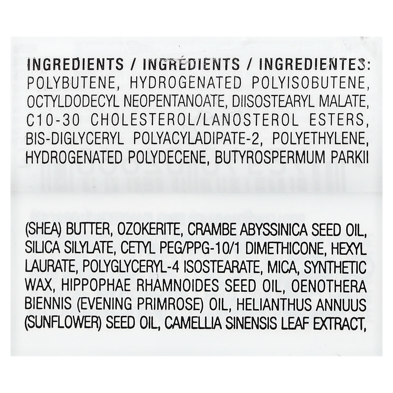 Полибутен, гидрогенизированный полиизобутен. октилдодецил неопентаноат, диизостеарил малат, эфиры холестерина/ланостерола c10-30, бис-диглицерил полиациладипат-2, полиэтилен, гидрогенизированный полидецен, масло ши (Butyrospermum parkii), озокерит, масло семян катрана абиссинского (Crambe abyssinica), силилат диоксида кремния, цетил ПЭГ/ППГ-10/1 диметикон, гексил лаурат, полиглицерил-4 изостеарат, слюда, синтетический воск, масло из семян облепихи рамновидной (Hippophae rhamnoides), масло примулы вечерней (Oenothera biennis), подсолнечное масло (Helianthus annuus), экстракт листьев зеленого чая (Camellia sinensis).