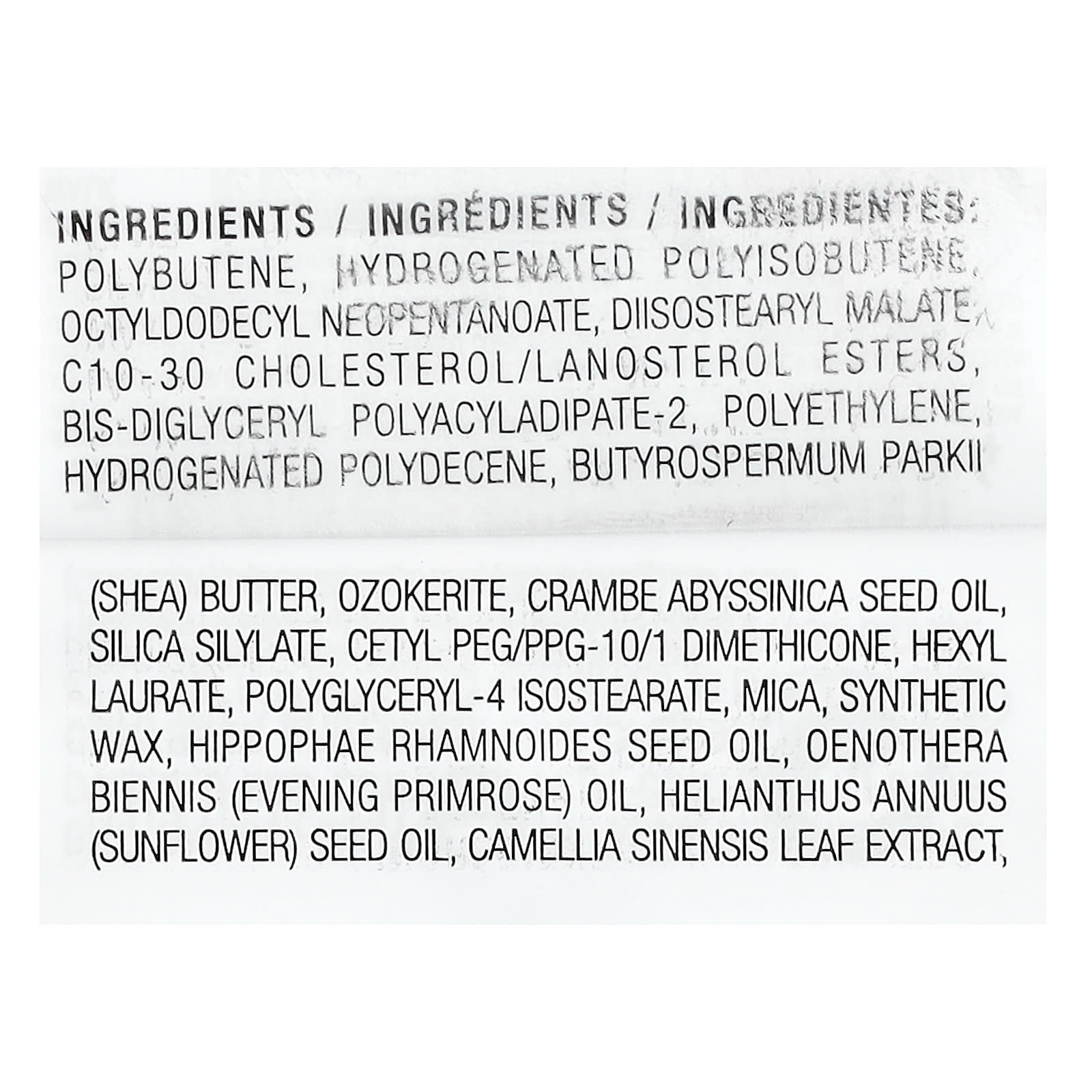 Полибутен, гидрогенизированный полиизобутен, октилдодецил неопентаноат, диизостеарил малат, с10-30 холестерол/ланостерол эфиры, бис-диглицерил полиациладипат-2, полиэтилен, гидрогенизированный полидецен, масло ши (Butyrospermum parkii), озокерит, масло семян катрана абиссинского (Crambe abyssinica), силилат диоксида кремния, цетил ПЭГ/ППГ-10/1 диметикон, гексил лаурат, полиглицерил-4 изостеарат, слюда, синтетический воск, масло из семян облепихи рамновидной (Hippophae rhamnoides), масло примулы вечерней (Oenothera biennis), подсолнечное масло (Helianthus annuus), экстракт листьев зеленого чая (Camellia sinensis).