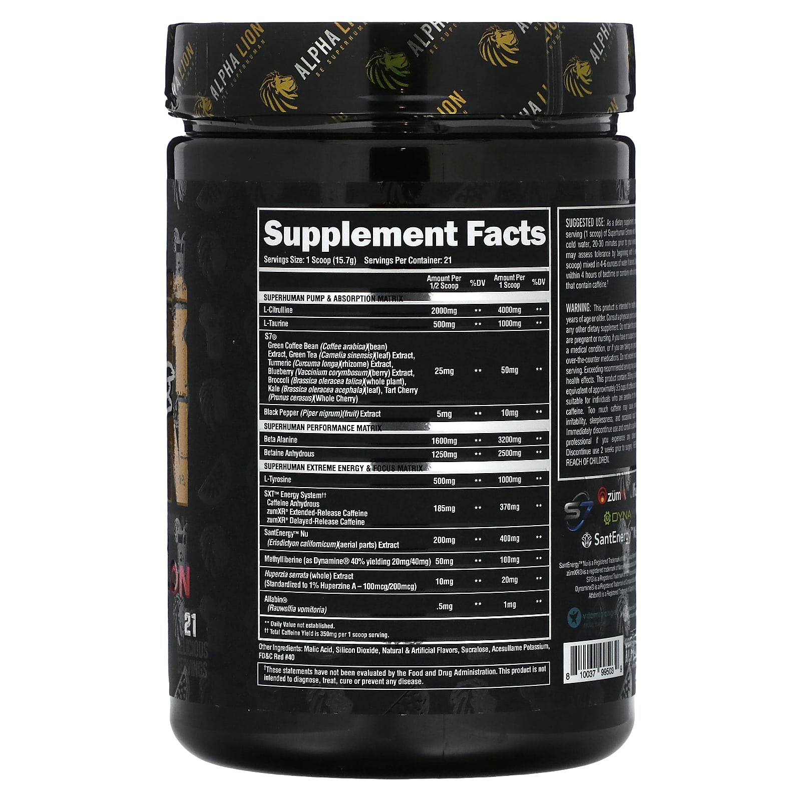 В качестве пищевой добавки принимайте 1 порцию (1 мерную ложку) Superhuman Extreme с 8–10 унциями холодной воды за 20–30 минут до тренировки. Пользователи могут оценить переносимость препарата, начав с ½ порции (½ мерной ложки), смешанной при желании с 4–6 унциями воды. Не принимать за 4 часа до сна и в сочетании с другими продуктами, содержащими кофеин.