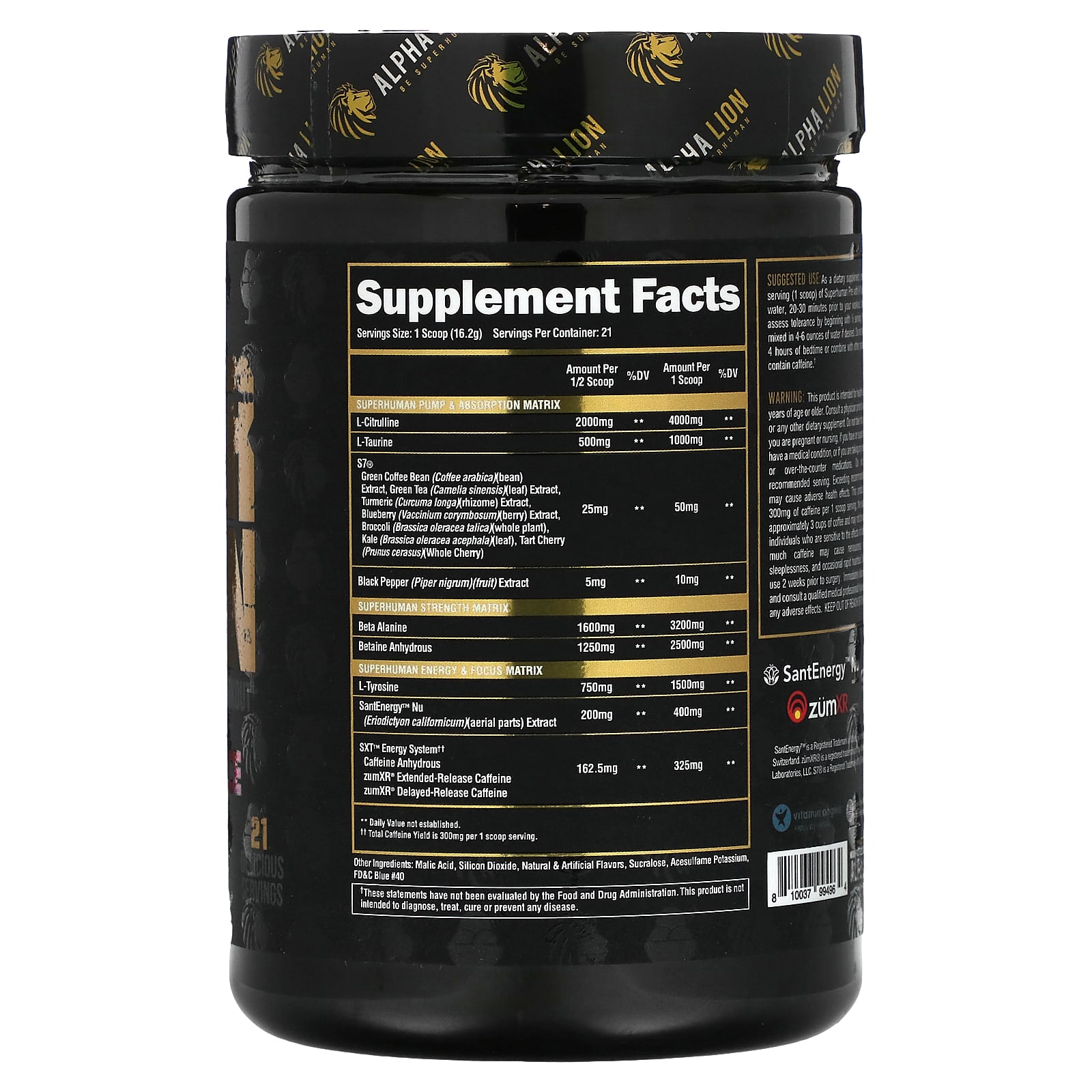 В качестве пищевой добавки принимайте 1 порцию (1 мерную ложку) Superhuman Pre с 8–10 унциями холодной воды за 20–30 минут до тренировки. Пользователи могут оценить переносимость препарата, начав с ½ порции (½ мерной ложки), смешанной при желании с 4–6 унциями воды. Не принимать за 4 часа до сна и в сочетании с другими продуктами, содержащими кофеин.